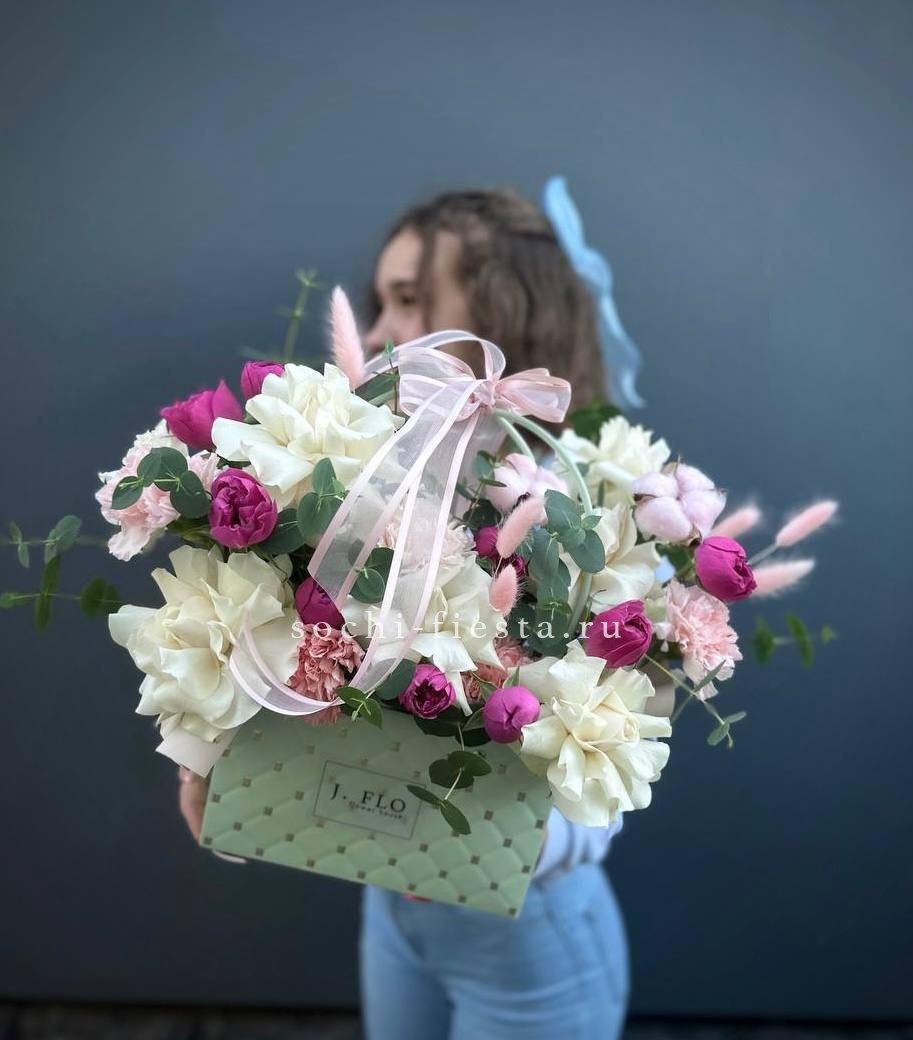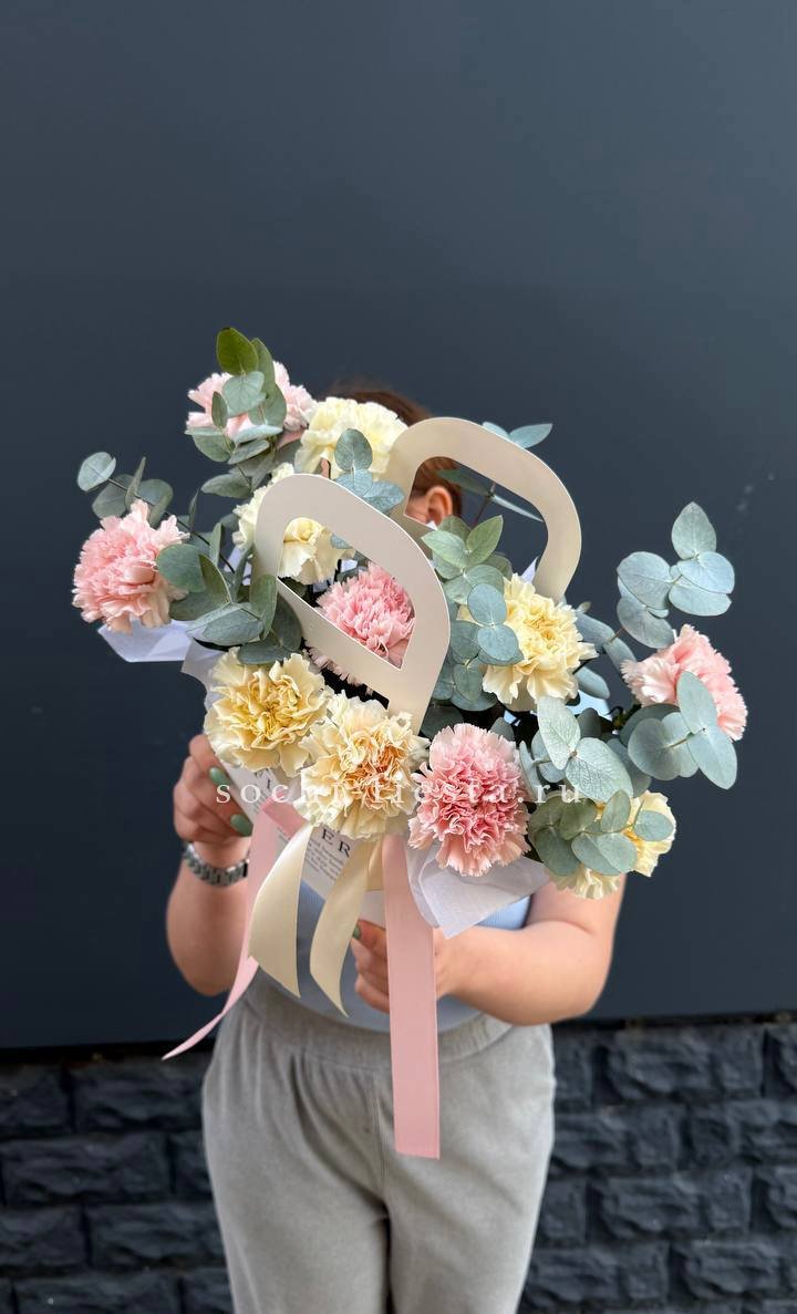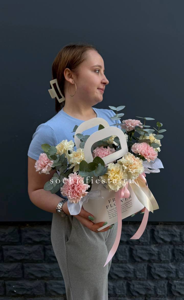 Миниатюрная композиция в удобной сумочке сочетает пышные головки хризантем с бархатистыми розами и воздушным диантусом. Веточки эвкалипта добавляют свежести, а компактная форма позволяет разместить цветы на рабочем столе или прикроватной тумбе.