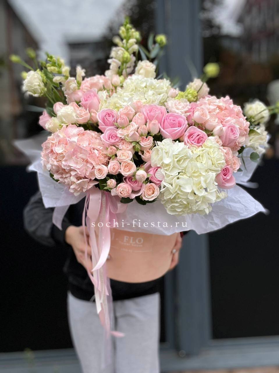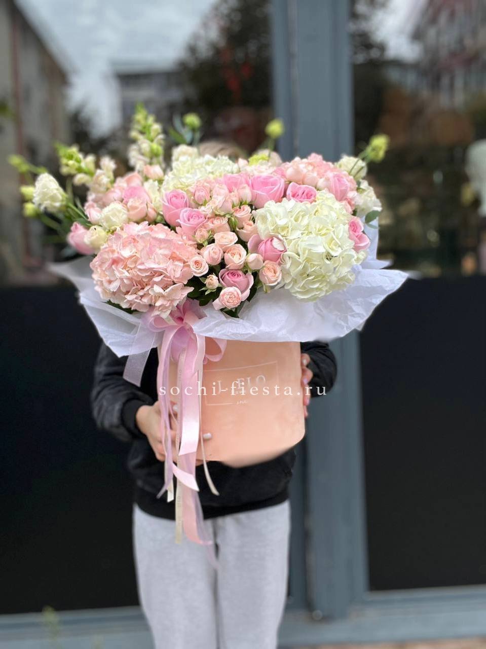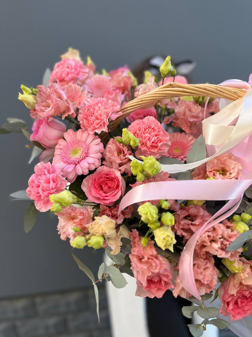 гортензия, диантус, розовая роза, эустома, гербера, корзина средняя, наполнение.