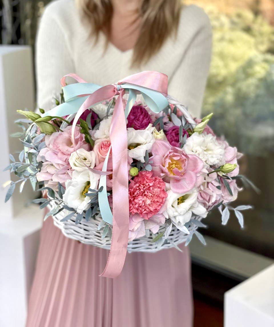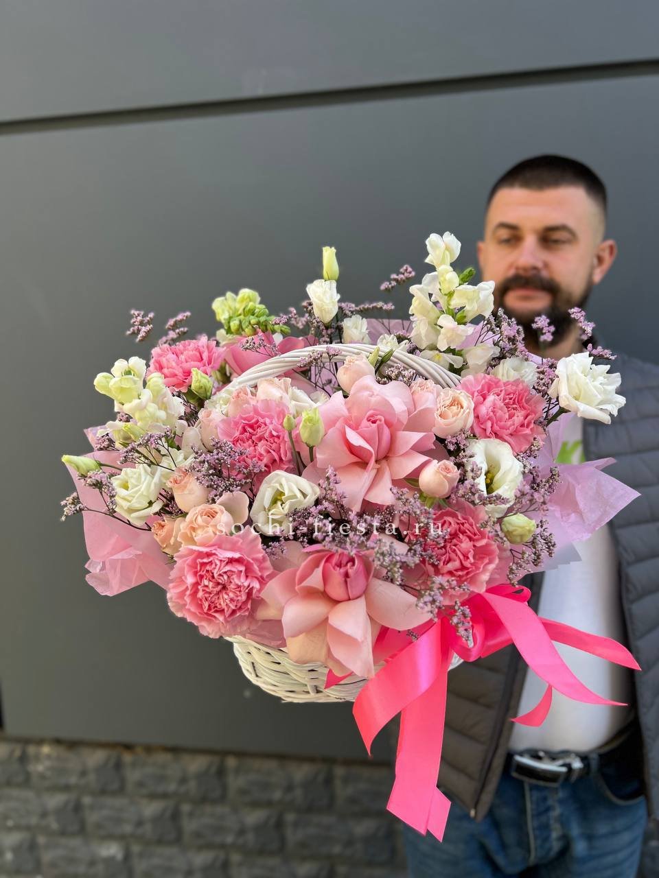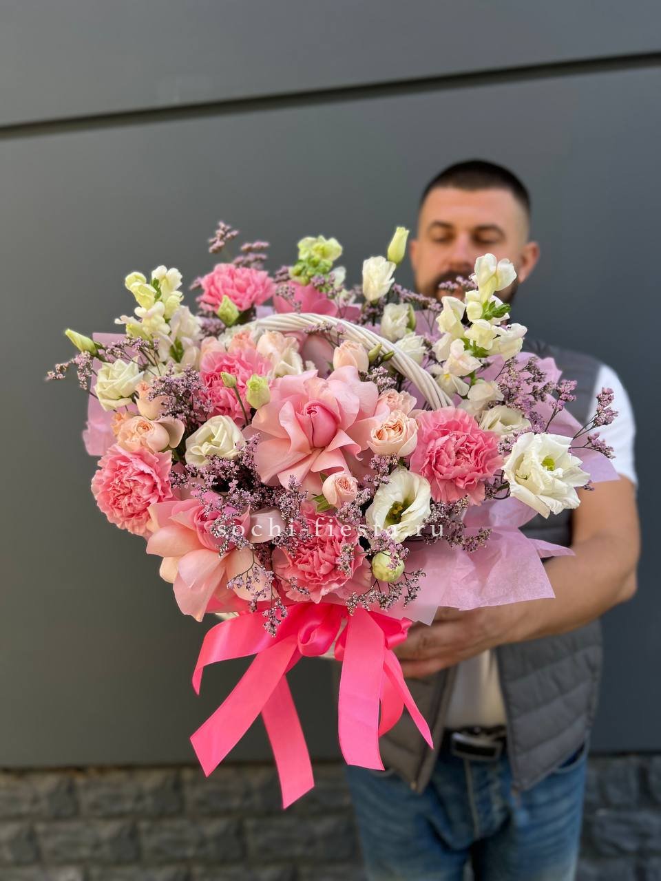Пышная корзина с бархатными гортензиями и розами разных форм создает живописную композицию в романтичной гамме. Альстромерии и диантусы добавляют воздушности между крупными соцветиями.