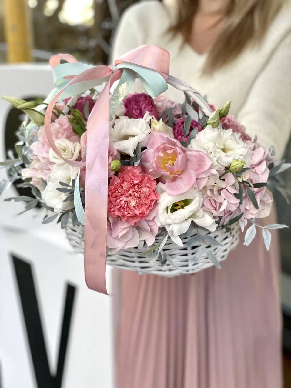 гортензии, розы одноголовые, диантусы, кустоые розы, альстромерии, эвкалипт, корзина.