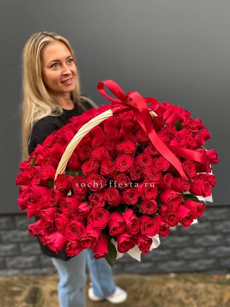 Пятьсот пятьдесят пять роз в корзине с персональной надписью — это целая инсталляция из живых цветов. Объём композиции впечатляет масштабом и создаёт незабываемое визуальное присутствие.