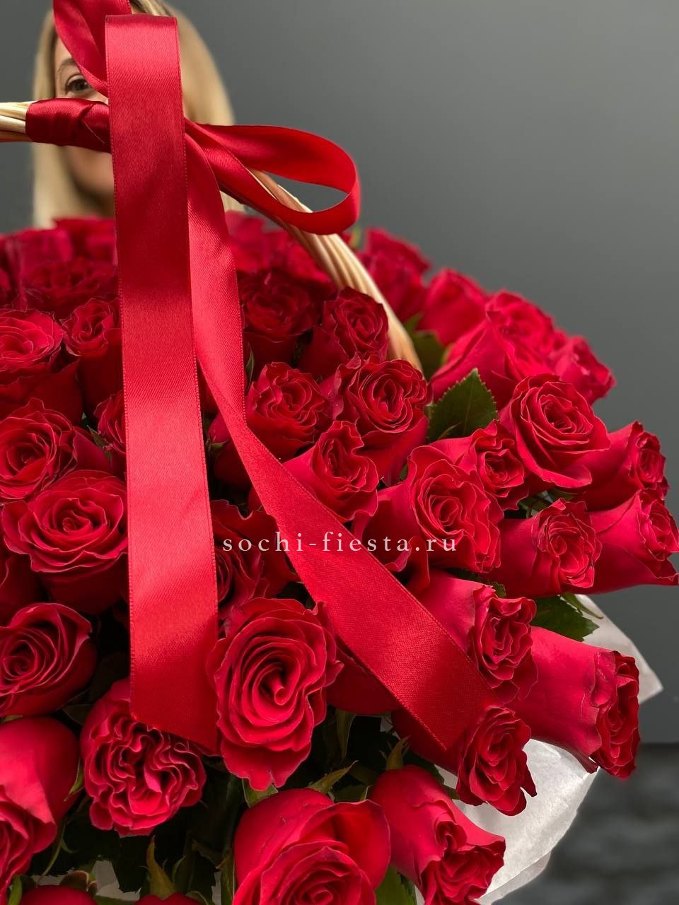 555 роз, зелень (папоротник или эвкалипт, в зависимости от сезона) оформление в корзину. Длина надписи не должна превышать 4 букв.