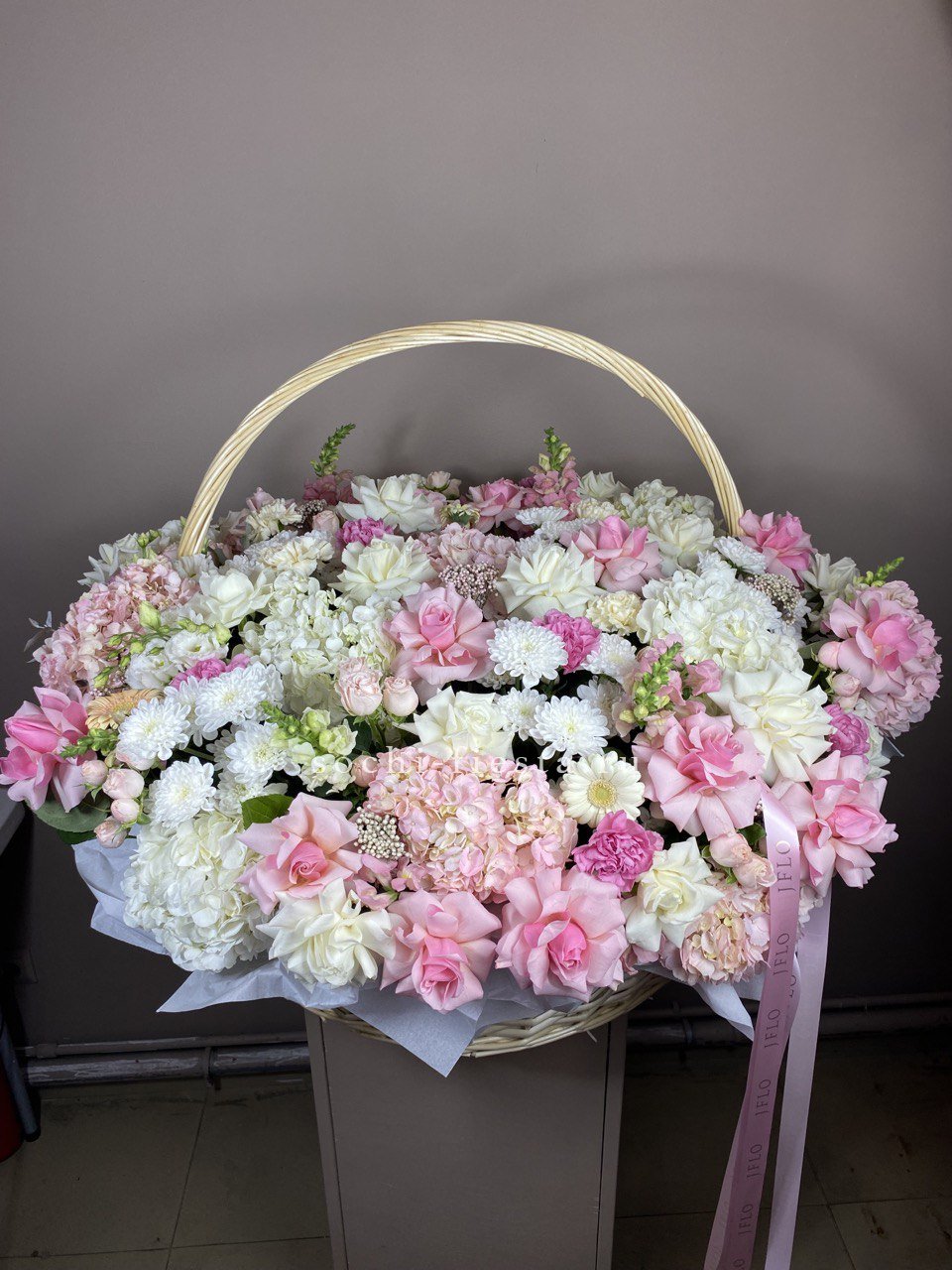 кустовые розы, одноголовые розы, диантусы,  гортензия, эустома, антиринум, озатамус, хризантема, герберы, лента, светлая корзина.Состав может меняться в зависимости от сезонности.