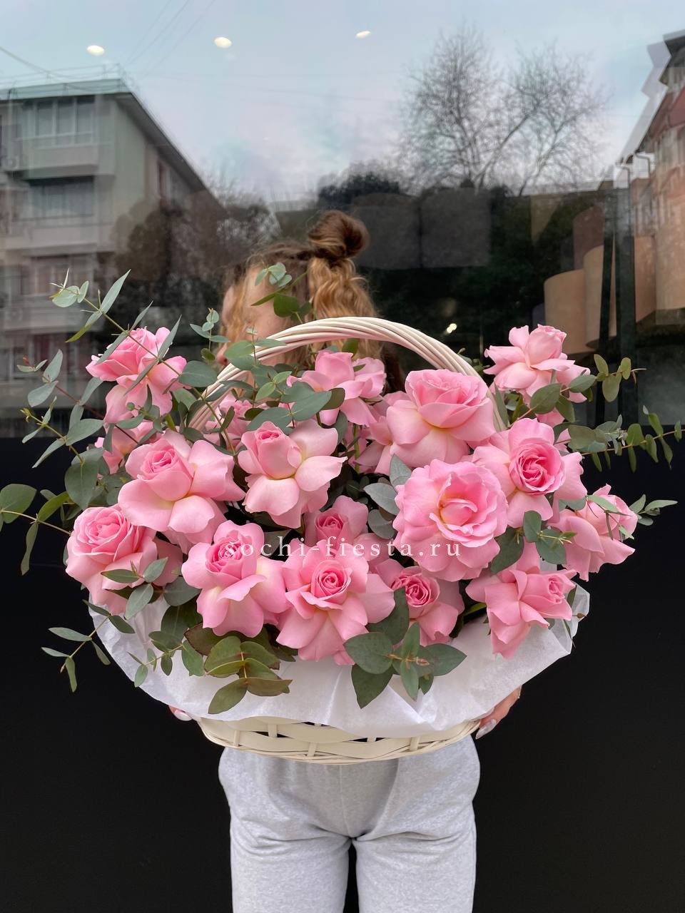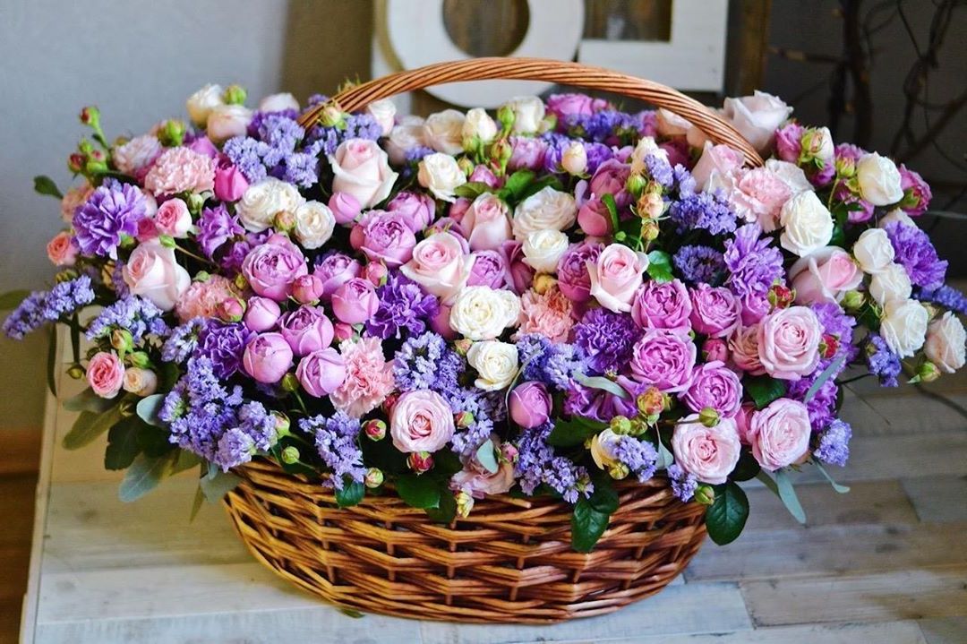 цветочная корзина с розами, мисти баблс, диантусами и гортензией.