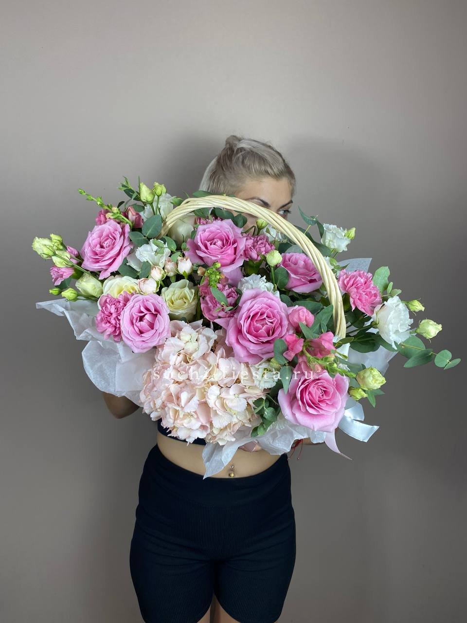 гортензия нежно-розовых оттенков, эустома, пионовидная кустовая роза, эвкалипт, диантус, антиринум, розы, лента, корзина.