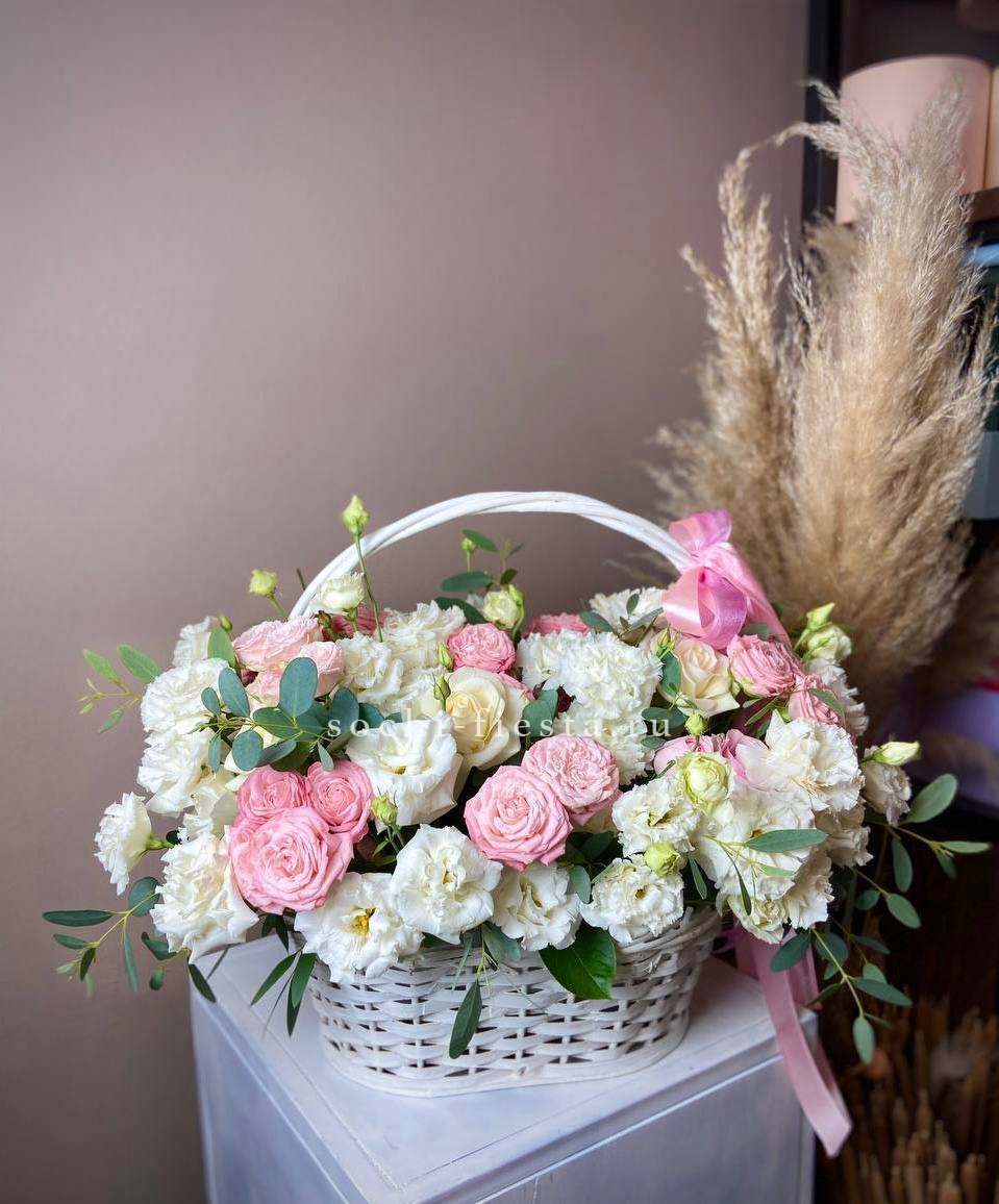Плетеная корзина вмещает густую композицию из лилий с добавлением эвкалипта. Объемная форма создает впечатление цветущего сада, собранного в одном месте.