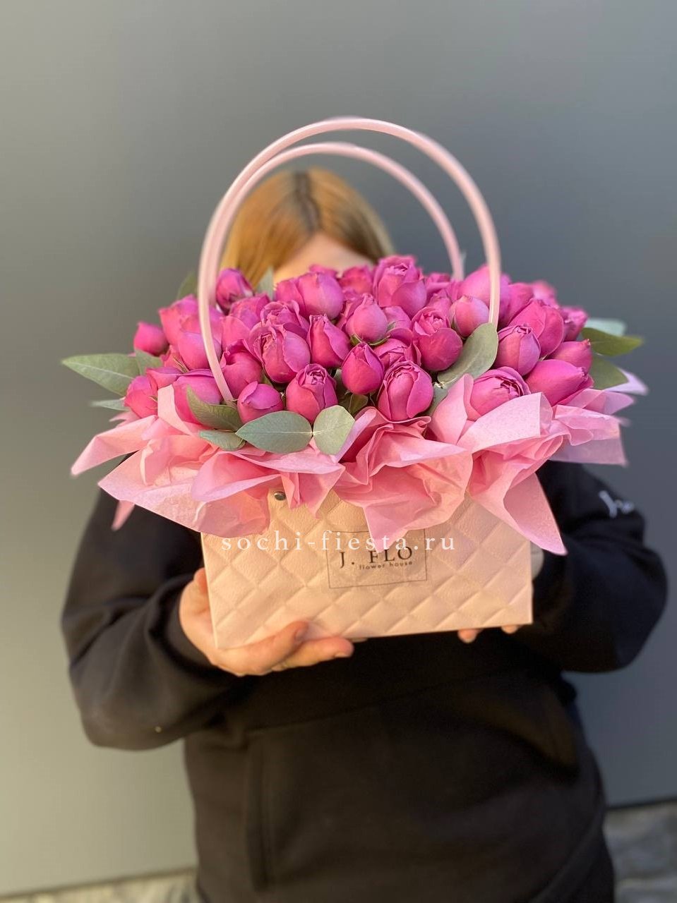 Пять кустовых роз Мисти Бабблс раскрываются пышными головками с волнистыми лепестками. Эвкалипт добавляет свежести и объема. Композиция помещена в удобную сумочку.