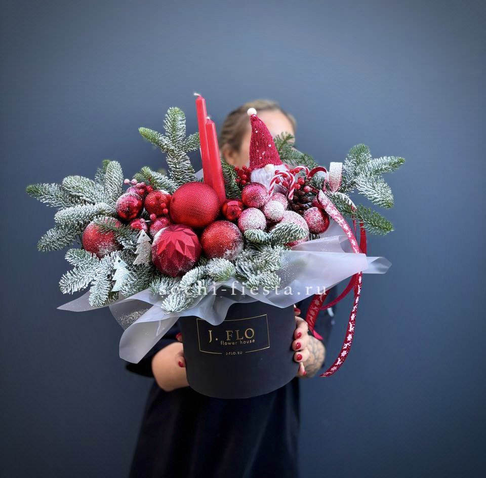 Красные акценты в игрушках и декоре задают яркий тон всей композиции. Свечи и пышная хвоя нобилиса выстраивают праздничный ритм с насыщенной цветовой подачей.