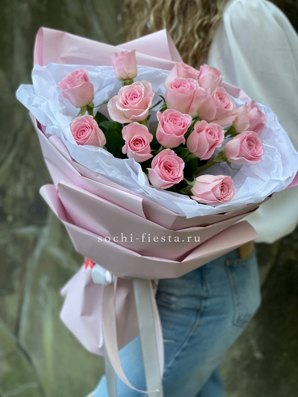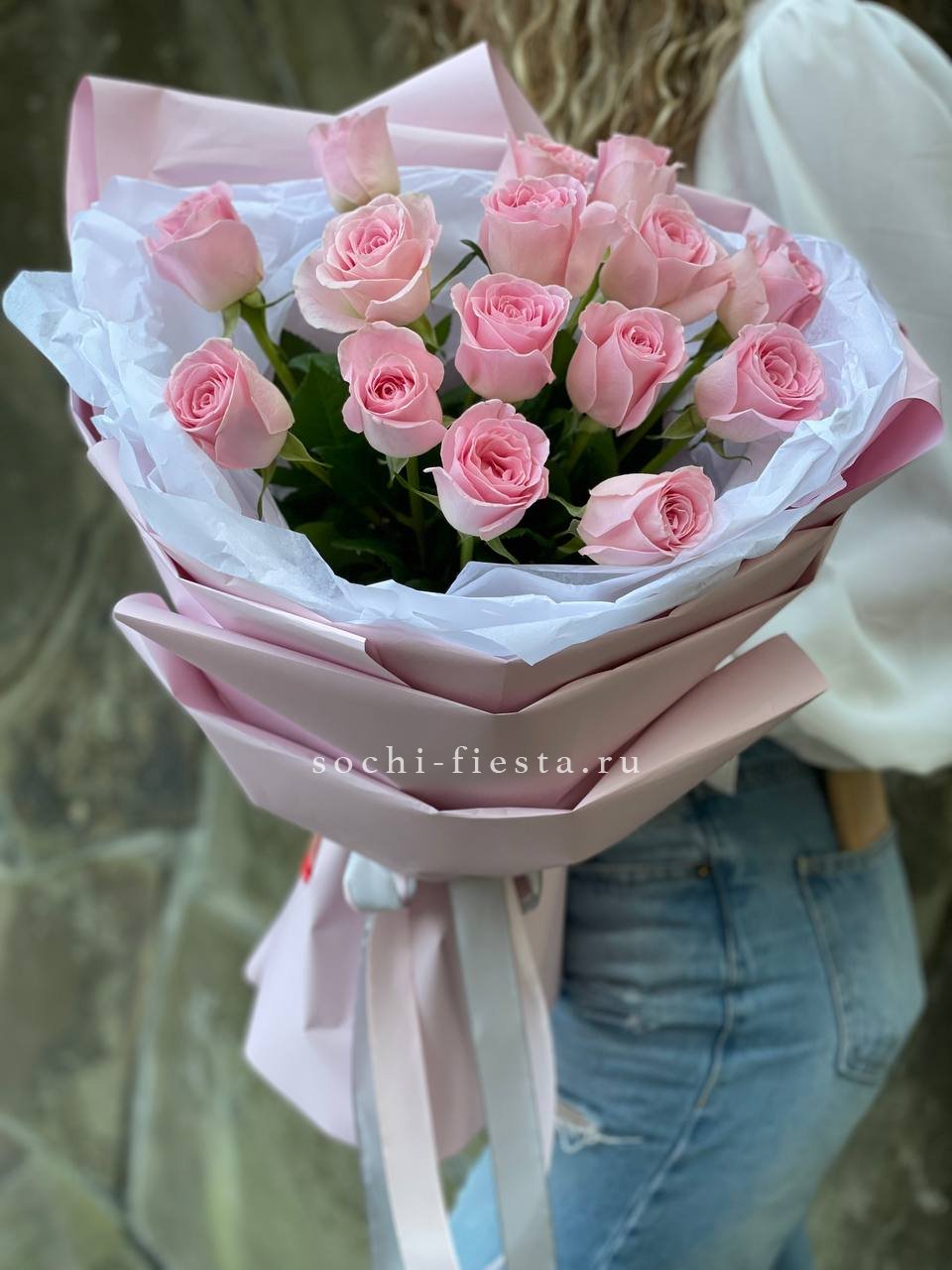 15 пионовидных кустовых роз бомбастик, лента, крафт.