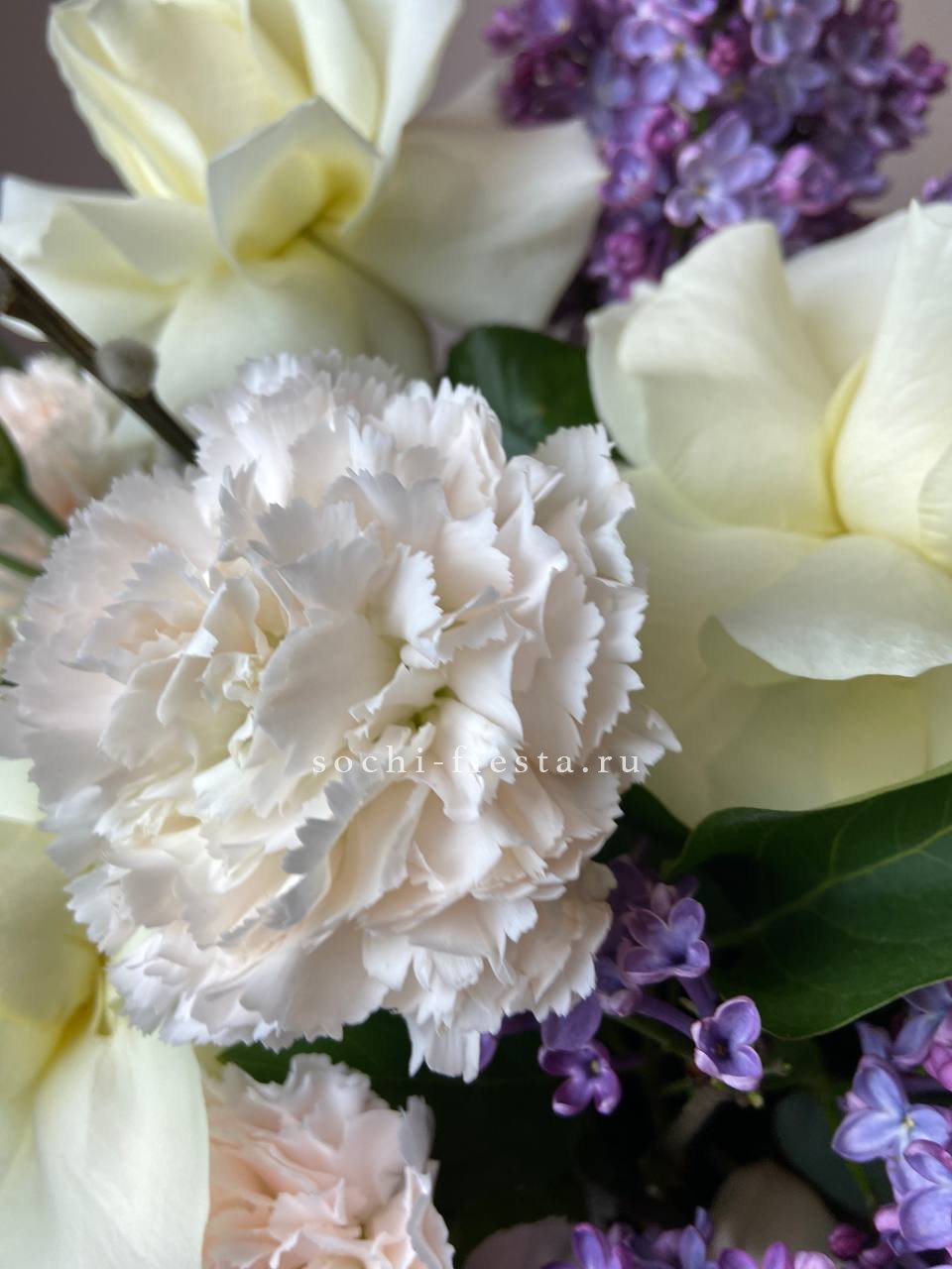 Белые розы образуют спокойную основу композиции, а ветви вербы добавляют вертикальный ритм. Сирень и диантусы заполняют пространство между крупными бутонами, создавая объёмную текстуру. Бокс удобно размещается на столе и сохраняет форму без дополнительного ухода.