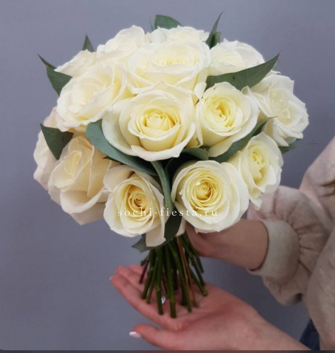эустома, одноголовые розы, сопутствующие элементы (мелкие цветы или бруния в зависимости от сезона), эвкалипт, лента.