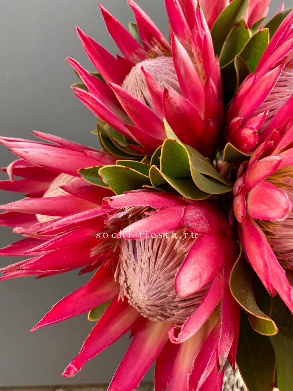 Крупные соцветия с плотными чешуйчатыми лепестками создают графичный акцент в любой композиции. Протея хороша сама по себе и эффектна в сборных букетах.