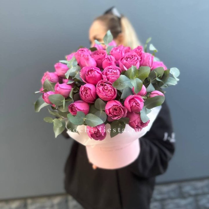Шляпные коробки с розами — удобный подарочный формат. Флористическая губка внутри держит влагу, композиция стоит на столе 5-7 дней без пересадки в вазу. Популярный выбор на дни рождения коллег, выписку из роддома, юбилей родителей.