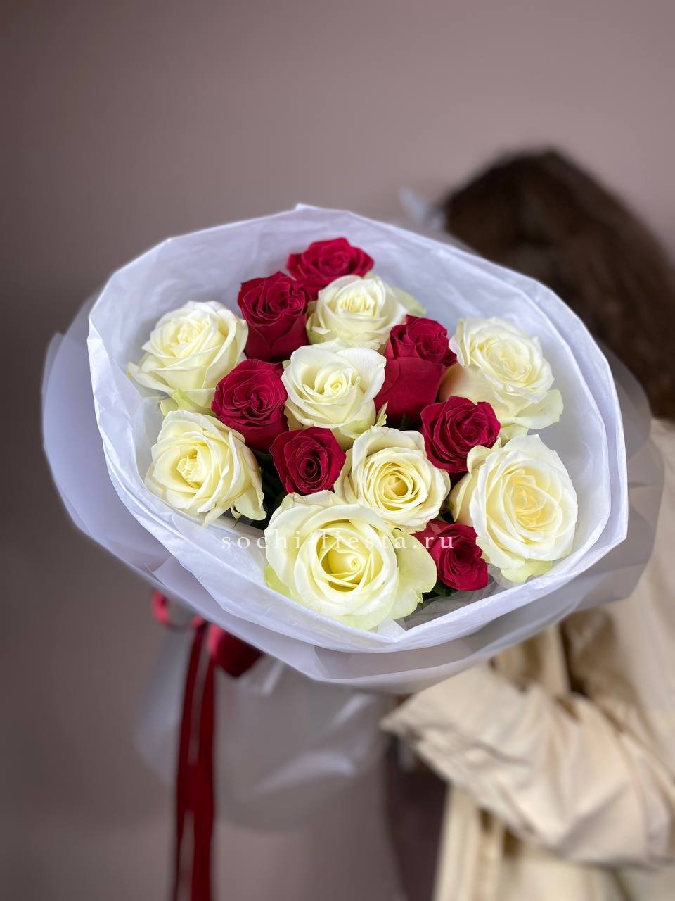 55 роз белого и розового оттенков или же с добавлением кремовой розы, лента, упаковка.
