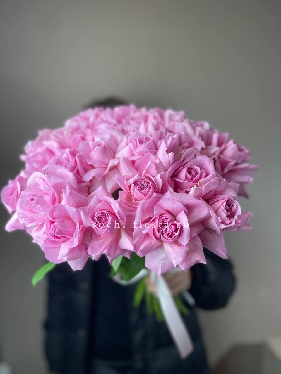 Двадцать пять вывернутых бутонов образуют плотную шапку цвета утренней дымки. Лепестки раскрыты наружу и создают объемную текстуру. Монобукет для тех, кто ценит чистоту формы.