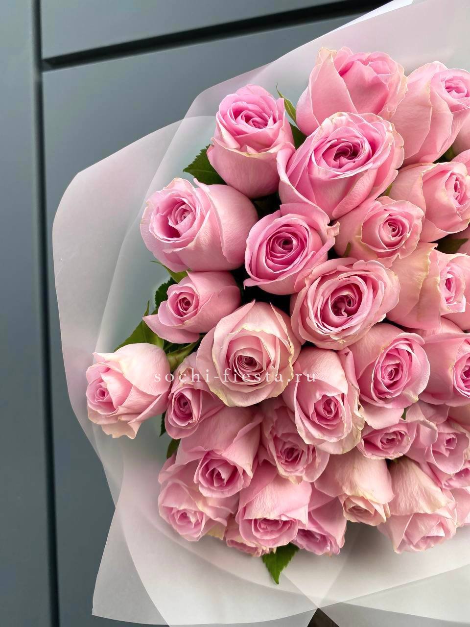 Семьдесят одна роза сорта Маритим образует объемную композицию с плотной структурой. Розовые лепестки создают мягкое цветовое пятно, которое заполняет пространство и удерживает внимание.