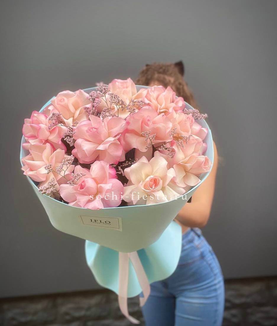 Французские розы с лимониумом образуют плотный силуэт с живым ритмом. Вертикальные линии соцветий задают направление, а бутоны удерживают форму без лишних акцентов.