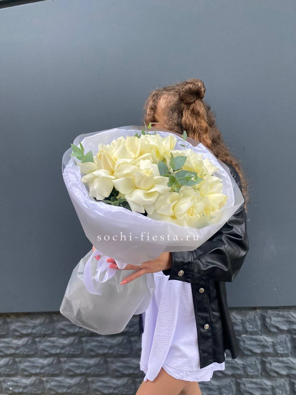 Семь вывернутых бутонов раскрываются широко и свободно, открывая слои белоснежных лепестков. Эвкалипт добавляет воздух и свежесть композиции.