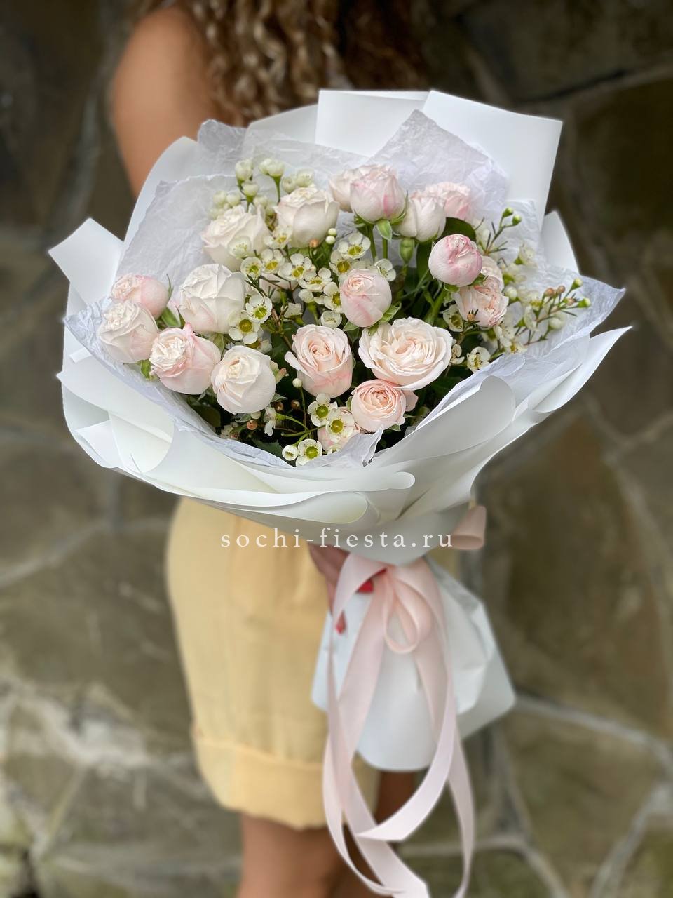 Семь пышных кустовых роз собраны в плотный круг и обрамлены воздушными ветками хамелациума. Бутоны раскрыты почти полностью, создавая объёмную шапку с мягкими переходами оттенков. Композиция держит форму и выглядит самодостаточно.