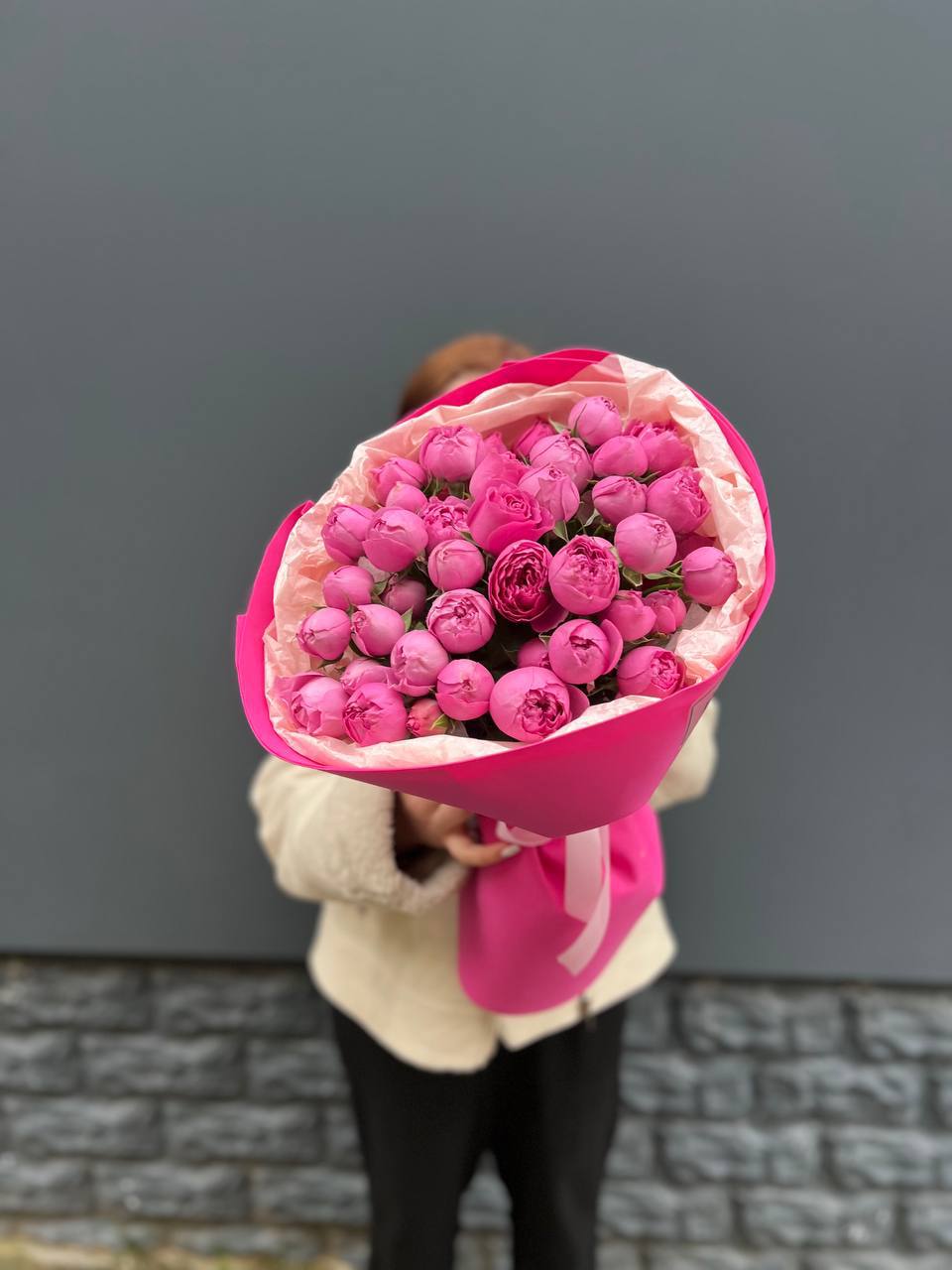 Спрей-розы раскрываются кустиками на гибких стеблях, образуя лёгкую живую структуру. Пятнадцать веток с множеством мелких бутонов придают букету естественную подвижность.