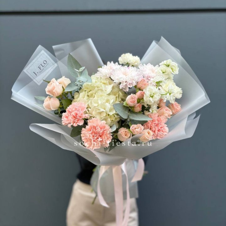 авторский сборный букет для регионального города с сезонными цветами и зеленью