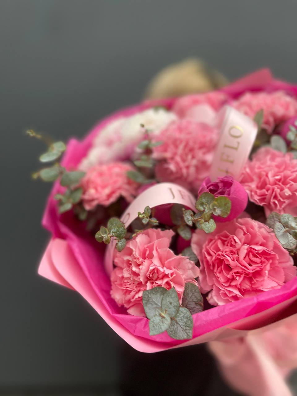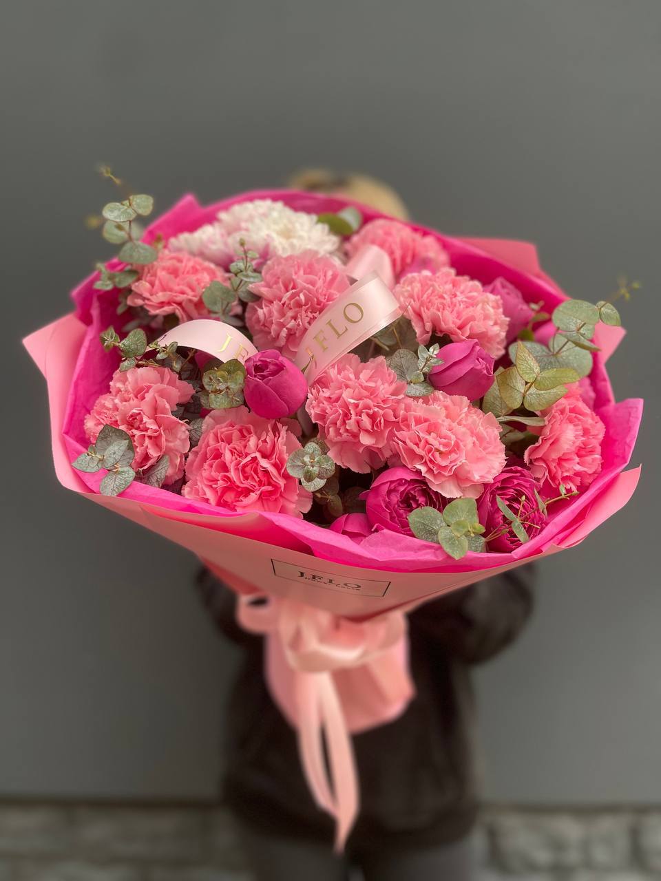 гортензия, эустома, кустовая роза, диантус, лента, упаковка Состав букета в несозон может нести незначительные изменения.