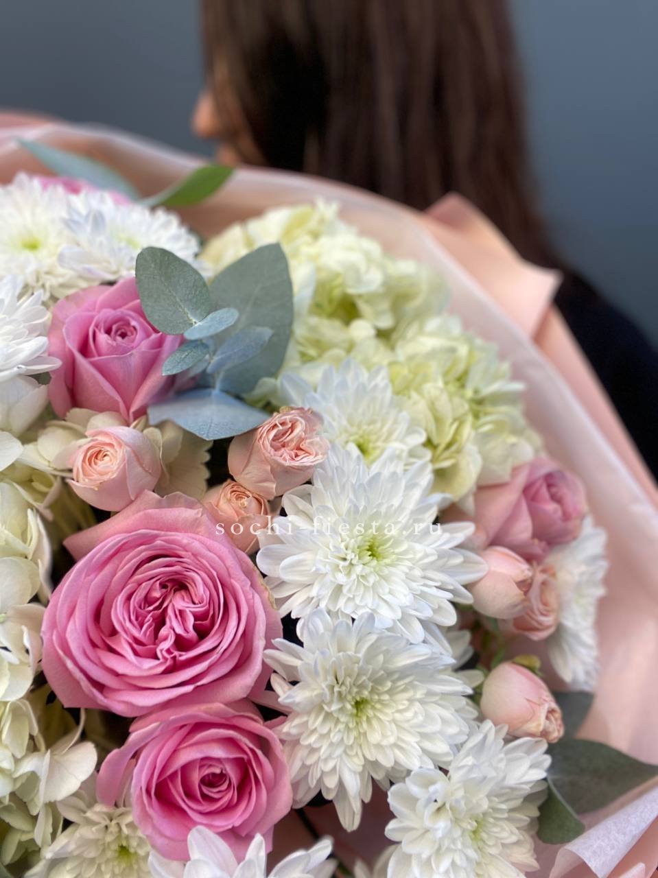 пионовидные кустовые розы мисти бабблс, белые розы, розовые розы, лента, дизайнерская пленка.