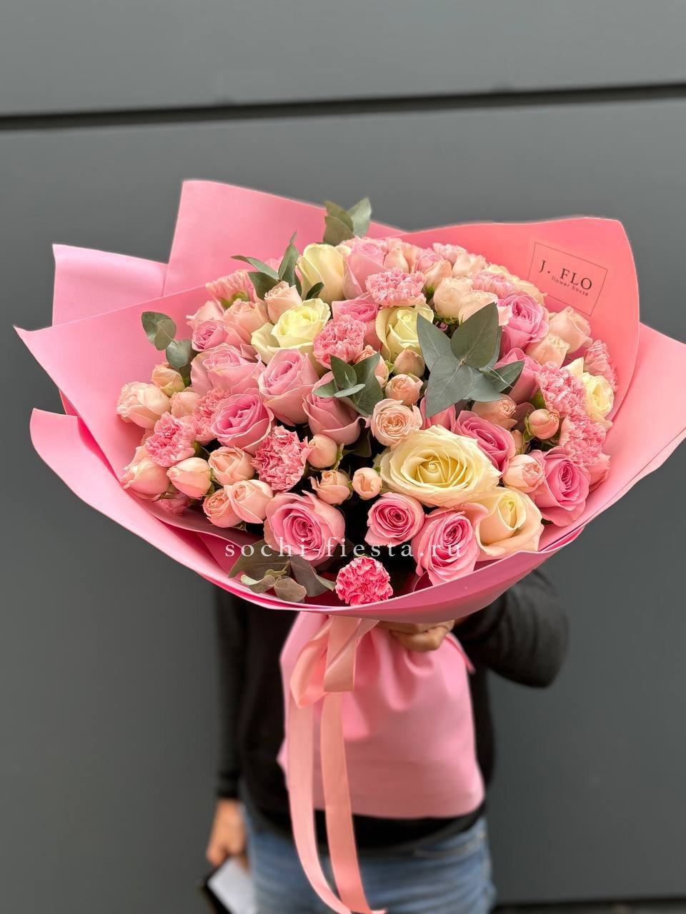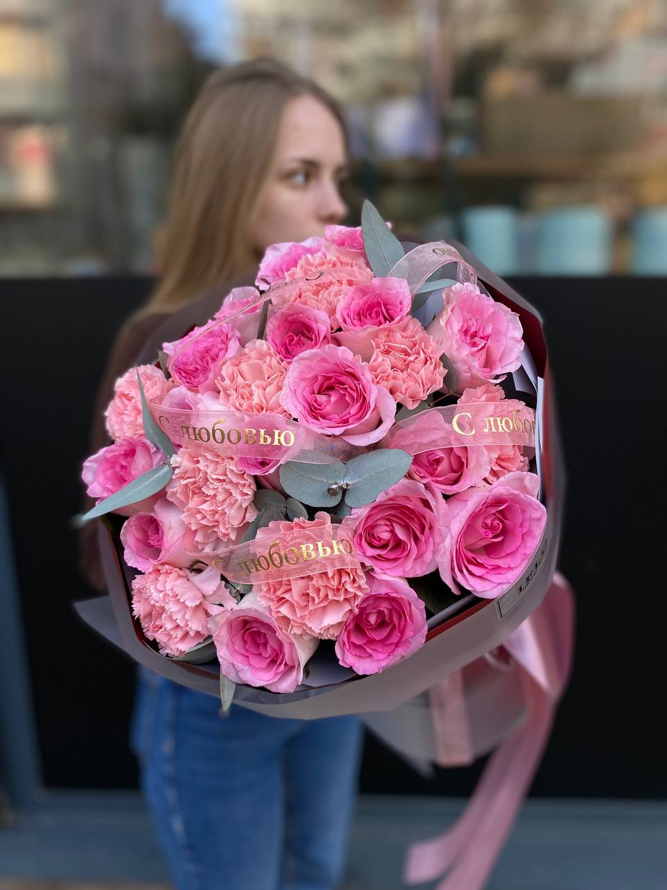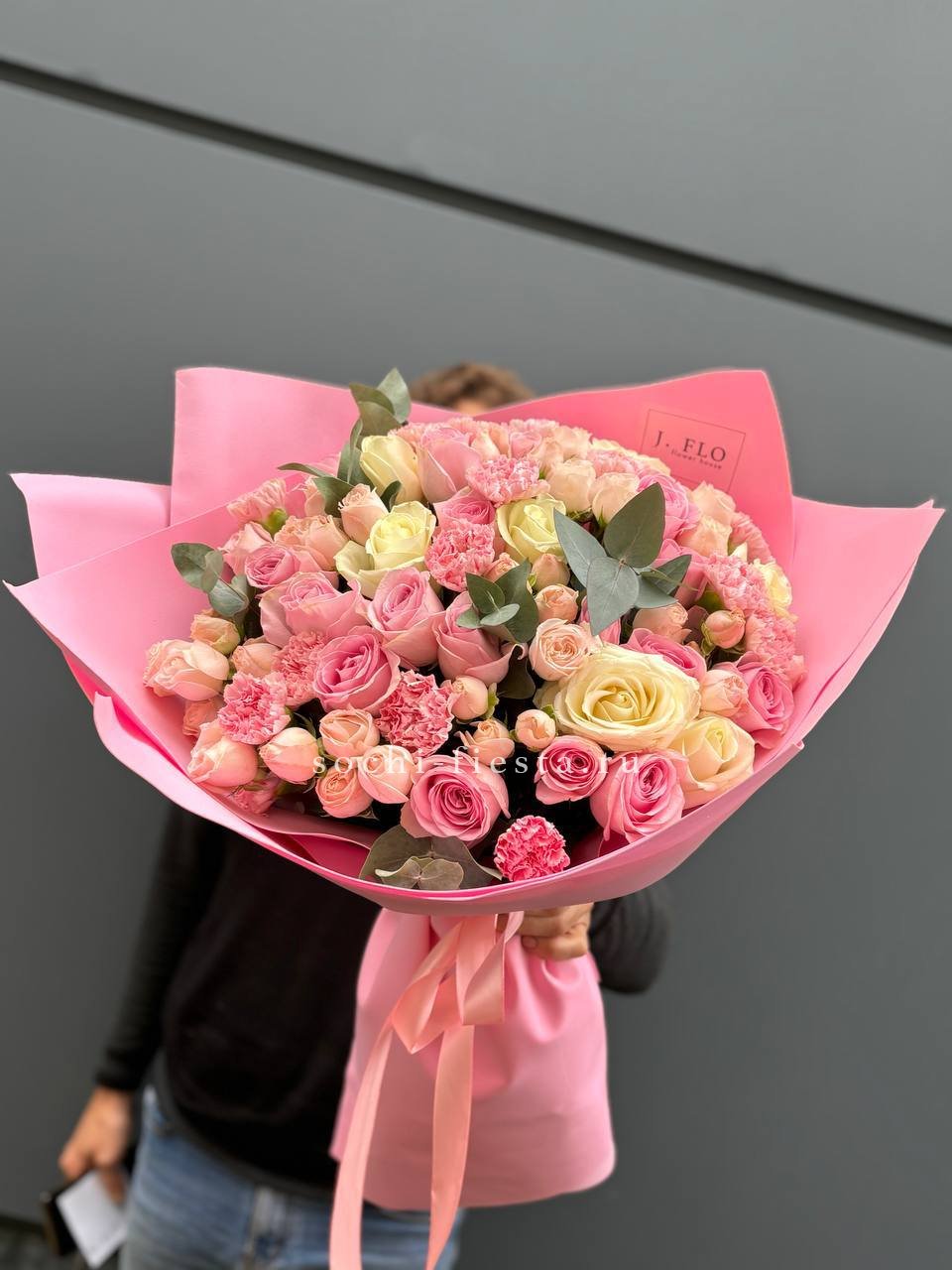 Розовые розы, пионовидная кустовая роза, эвкалипт,  лента, авторская упаковка.
