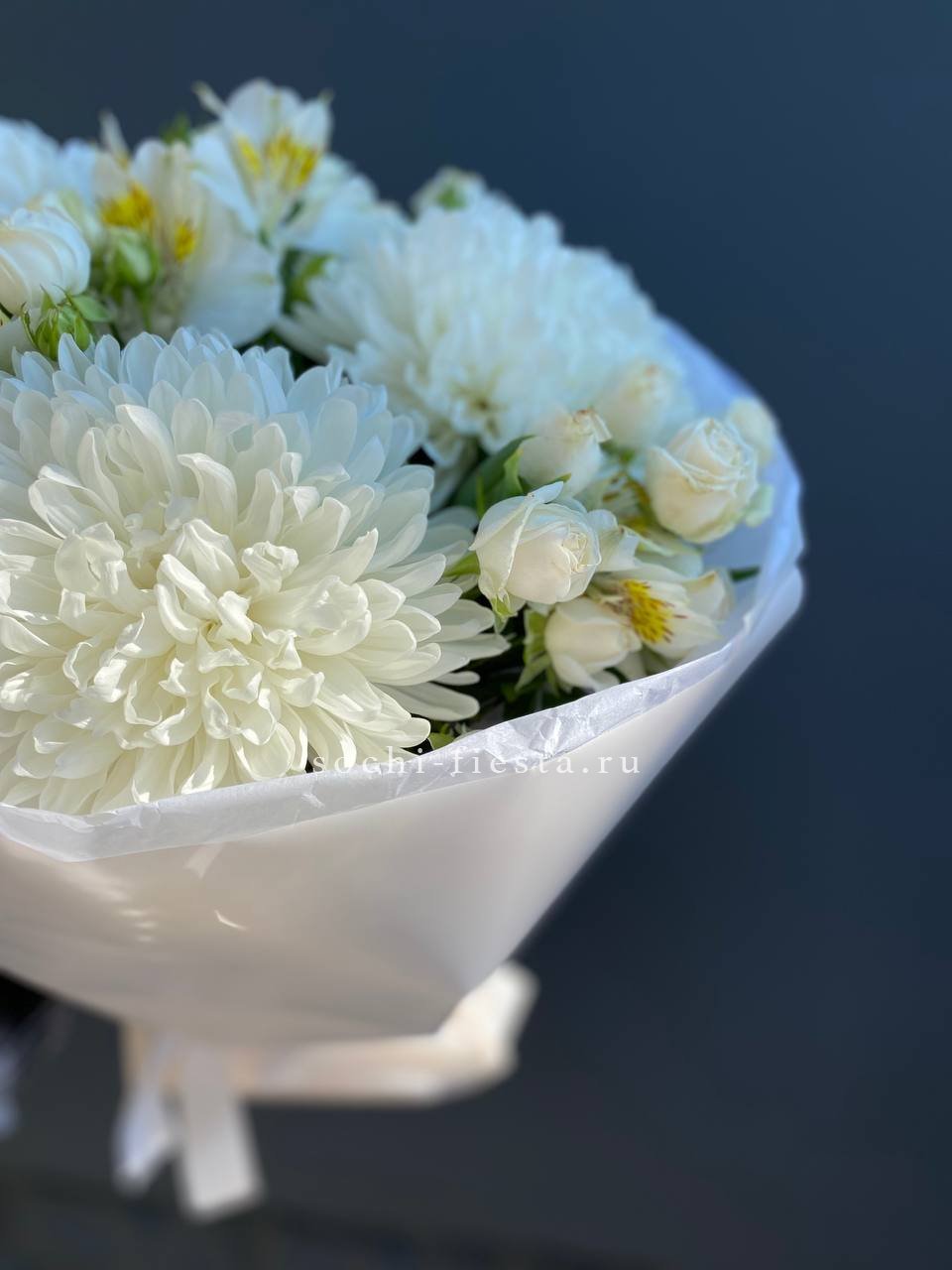 хризантема, кустовые розы, альстромерия, авторское оформление,  лента Возможна замена сезонных цветов.