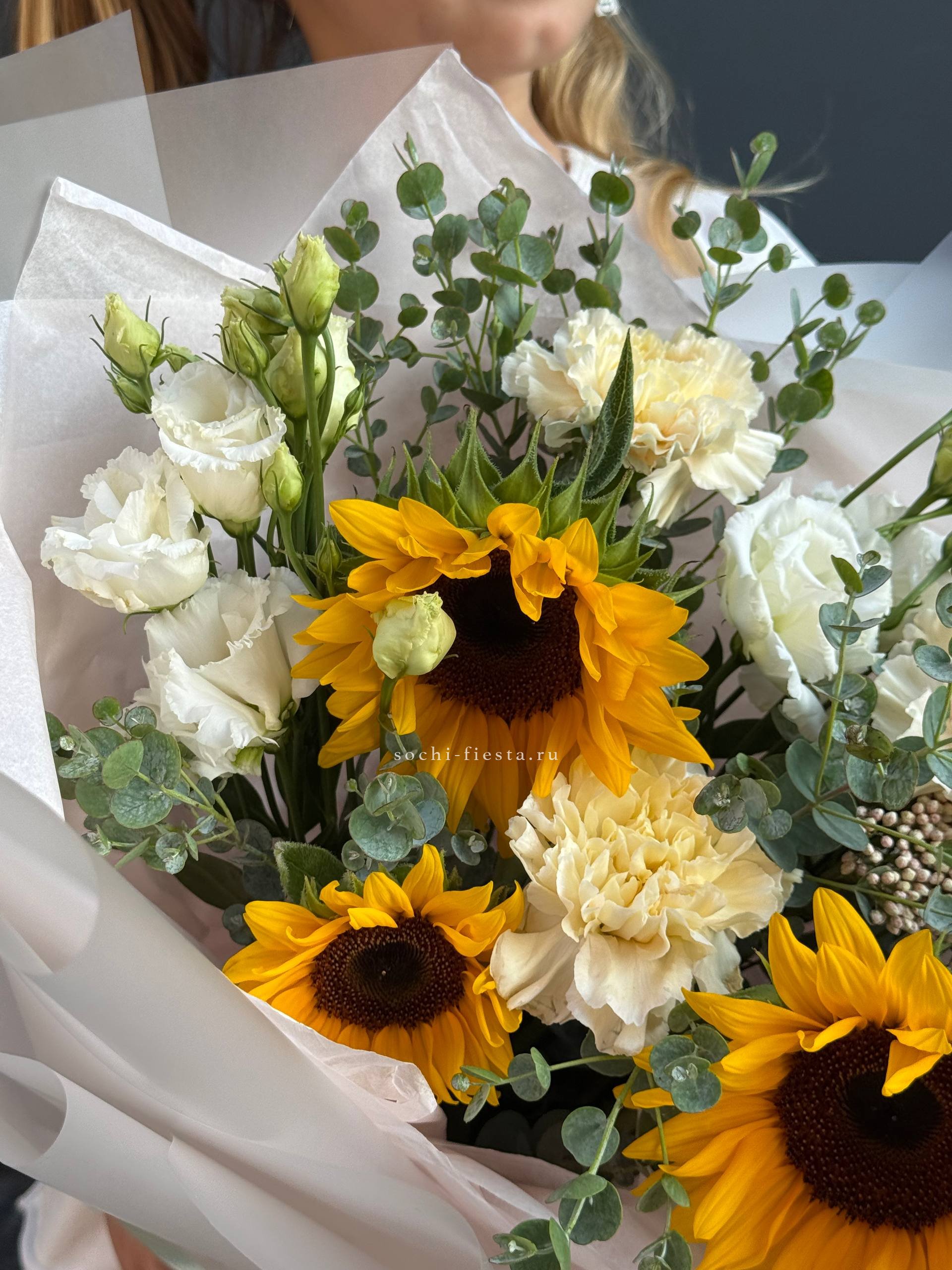 подсолнухи, диантусы, эустома, озатамус, эвкалипт, оформление.