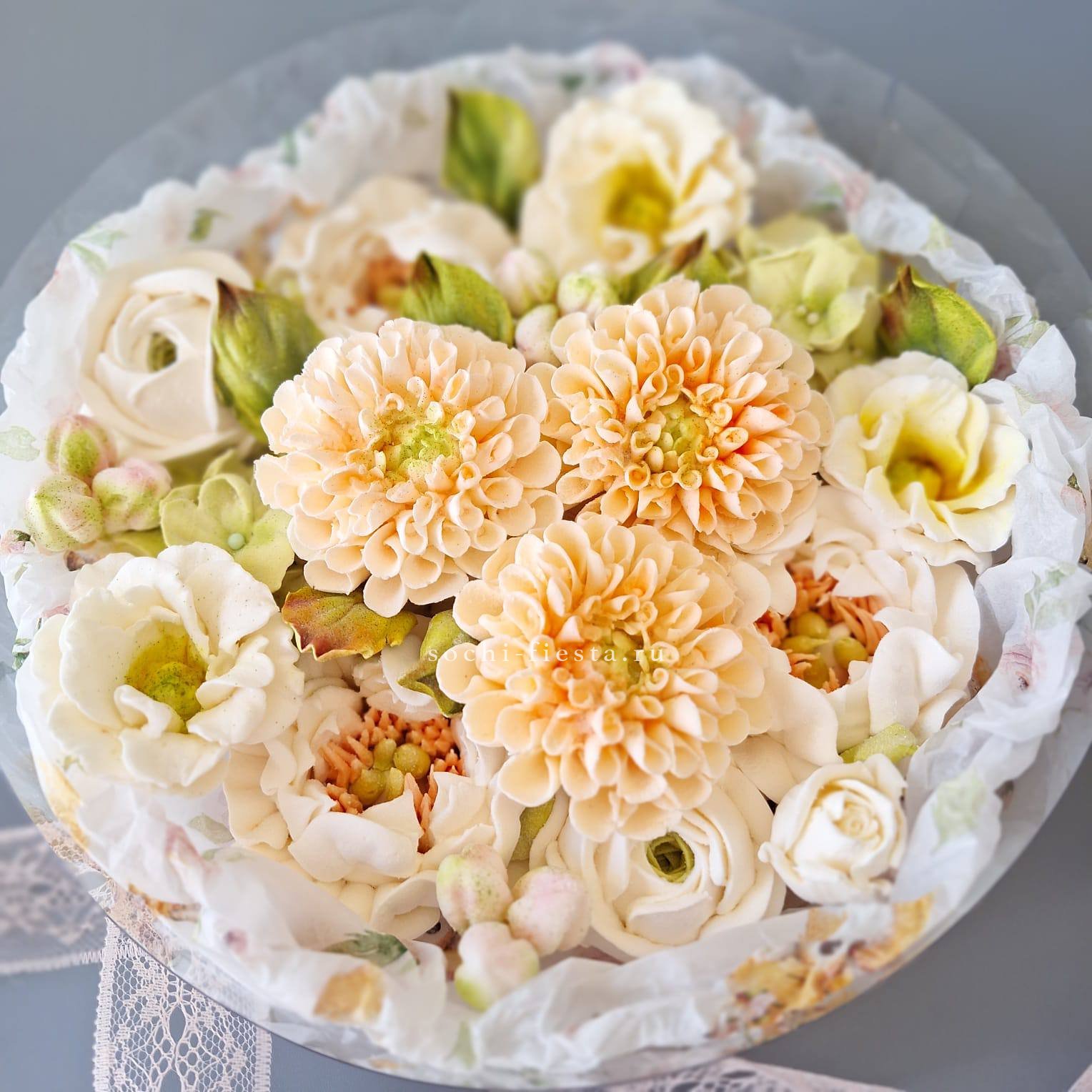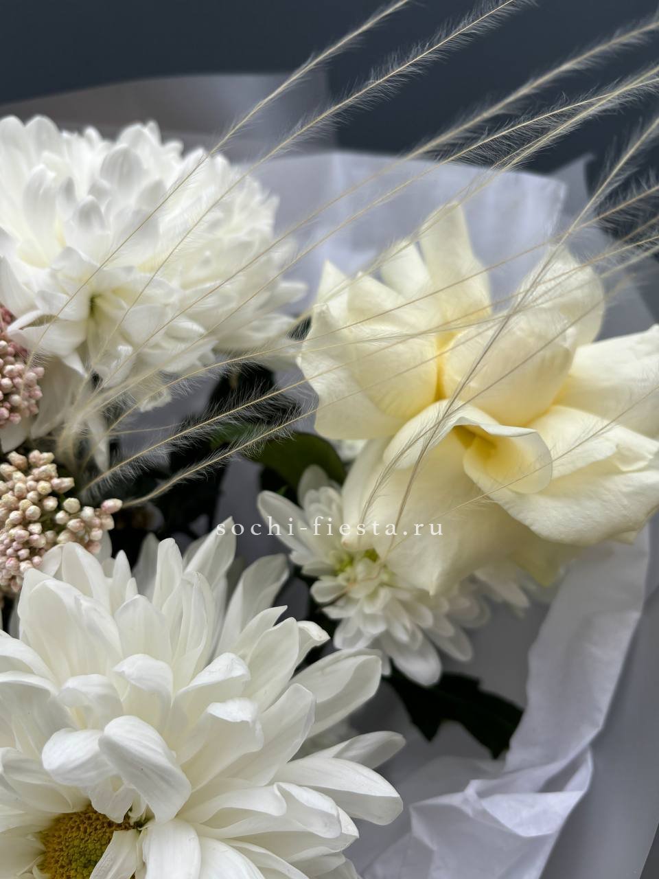 Пышные розы и бомбастик образуют округлую форму с мягкими переходами. Диантус заполняет промежутки между крупными бутонами, а эвкалипт добавляет воздушности композиции.