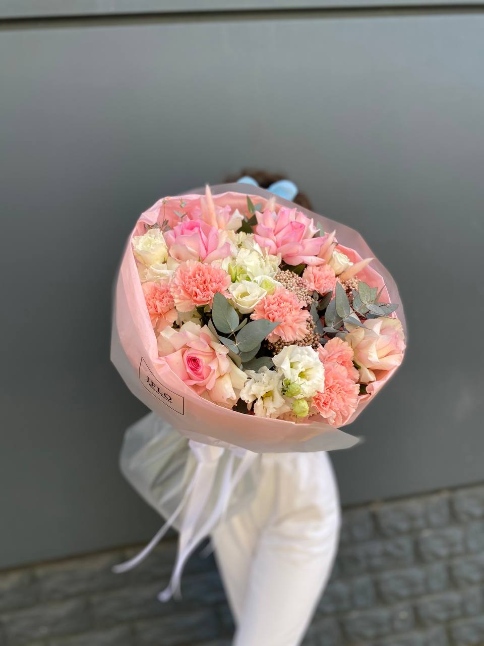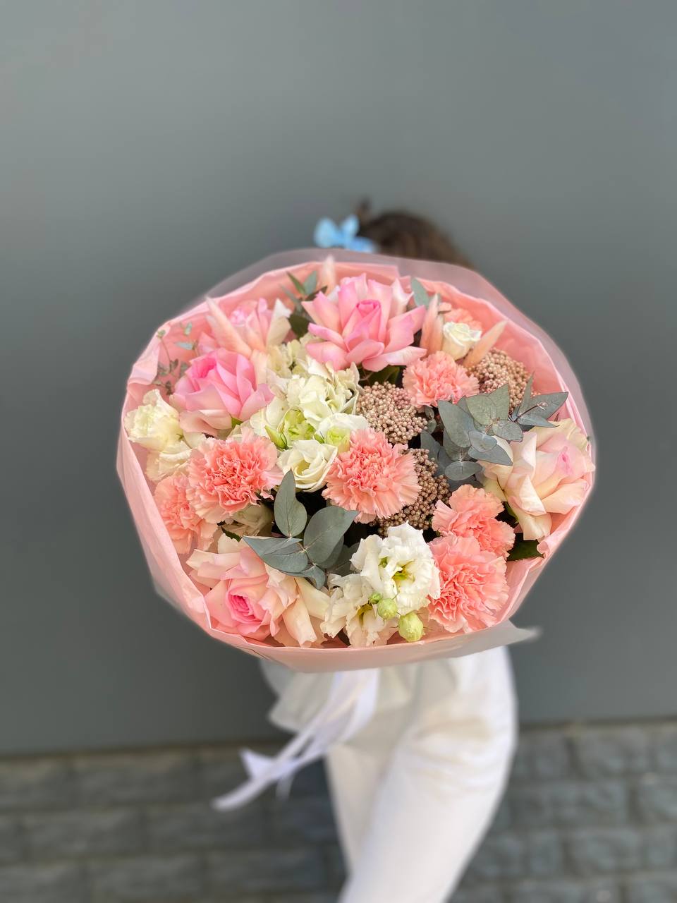 диантус, розы, бомбастик, эвкалипт, упаковка.