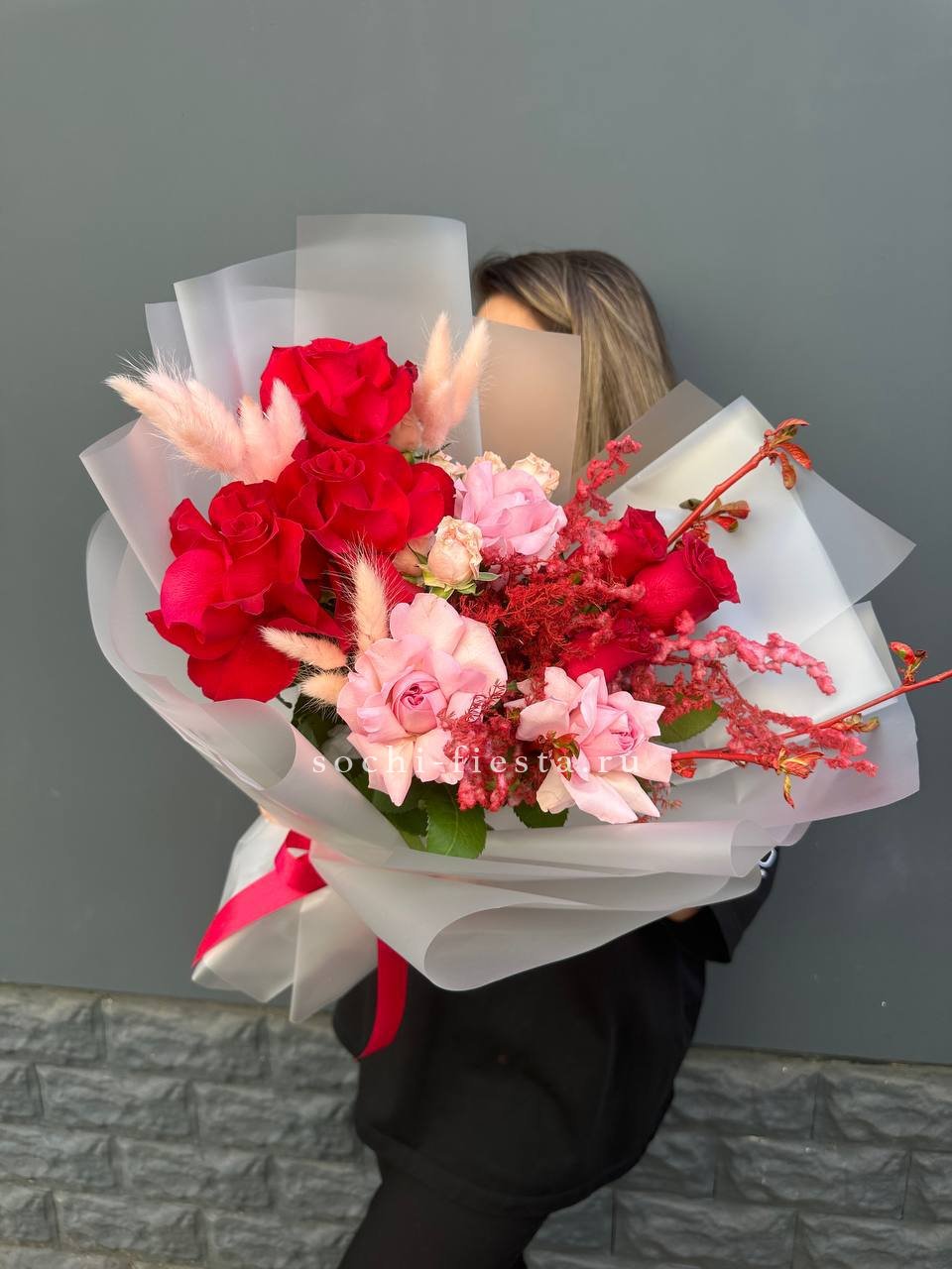 Красные и розовые оттенки переплетаются с цветущими ветками и пушистым лагурусом. Аспарагус добавляет воздушности, а кустовые розы заполняют пространство живой энергией. Букет держит форму и притягивает взгляд.