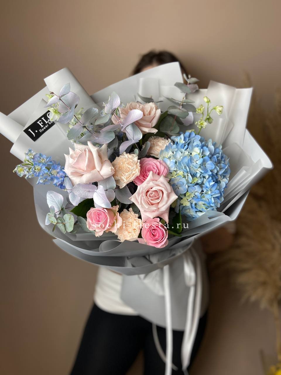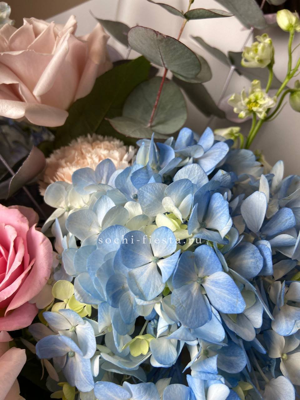 бигуди, гортензия, мисти баблс, розы, эустома, озотамус в нежном оформлении.