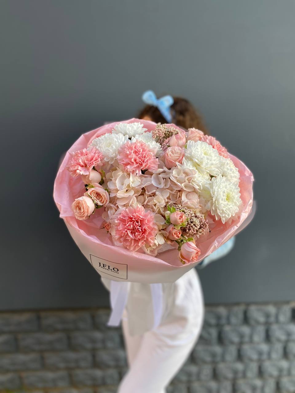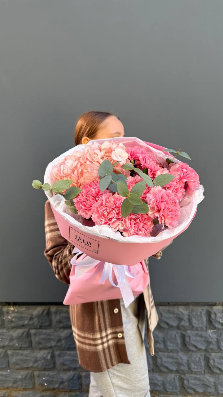 Яркая композиция объединяет пышную гортензию, игривые соцветия диантуса и солнечные хризантемы. Бомбастик добавляет объёма, а озотамнус создаёт лёгкую воздушность между крупными бутонами. Букет радует глаз насыщенными красками и жизнерадостным характером.