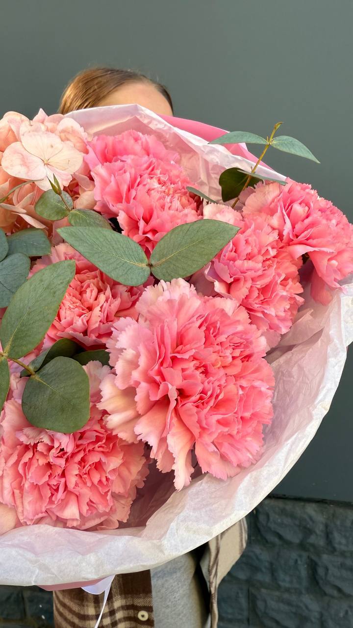 гортензия, диантус, хризантема, бомбастик, озатамус, пленка.