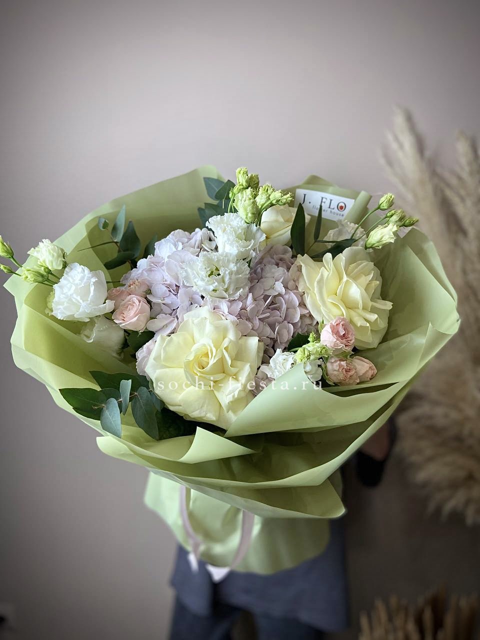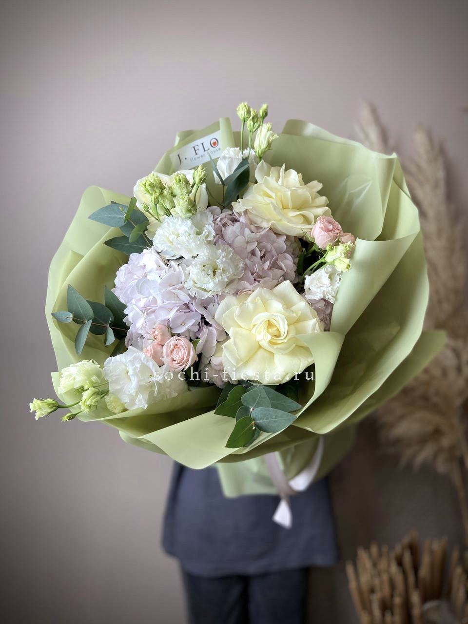Белые розы и эустома образуют светлую основу, которую дополняют пионы и гортензия. Крафтовая упаковка удерживает форму, позволяя цветам раскрыться естественно и свободно.