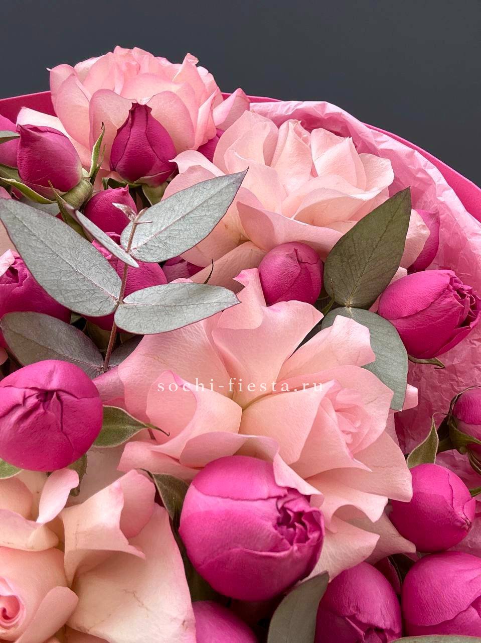 Кустовые розы и эустомы собраны в компактную форму с мягкими линиями. Сочетание нескольких оттенков создаёт живописный эффект без лишней пышности.