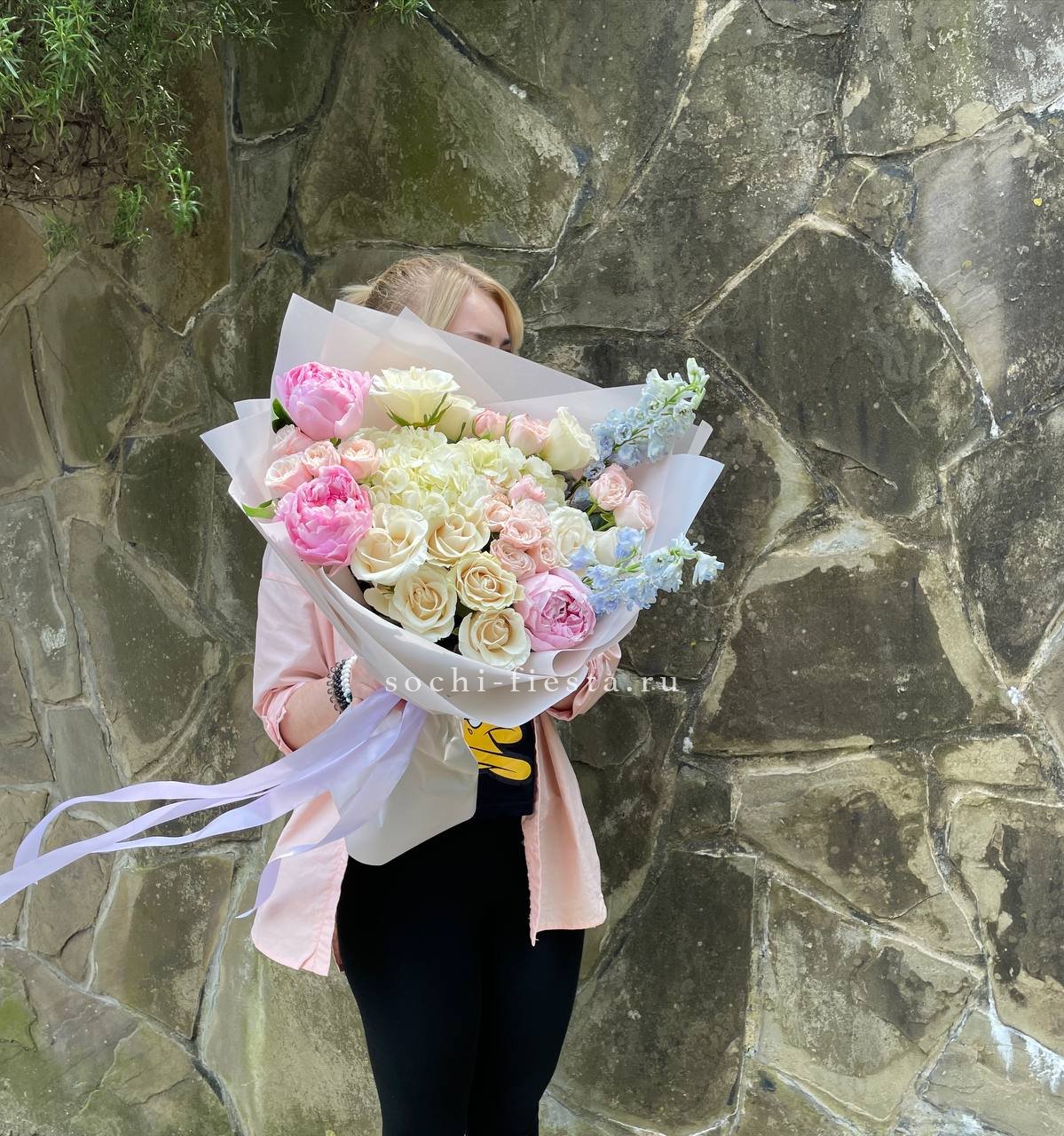 гортензия, пионы, кустовые пионовидные розы, одноголовые розы, дельфиниум (или аналог вне сезона), лента, дизайнерская упаковка.