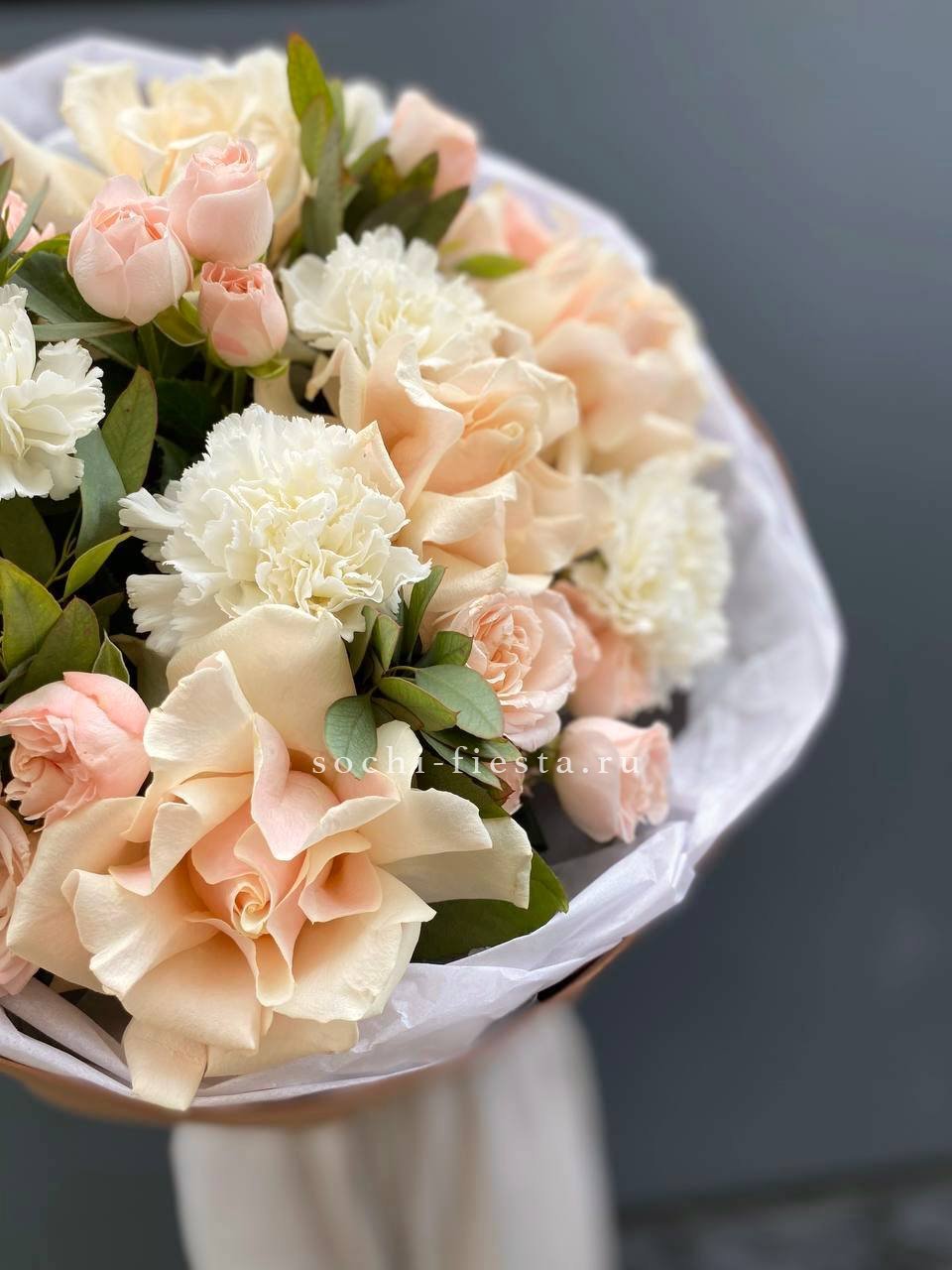 кустовые розы, кремовые розы, диантусы, эвкалипт лента и дизайнерская пленка.