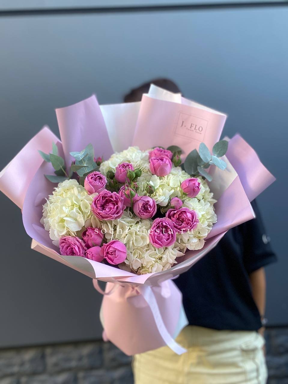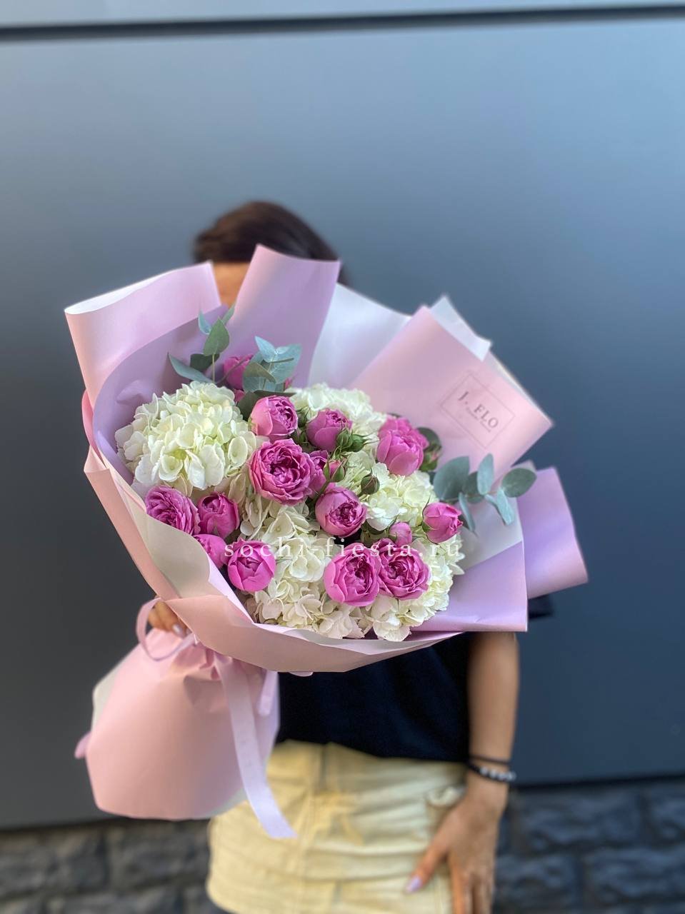 Пышные розовые бутоны переплетаются с воздушной эустомой, создавая объёмную композицию с мягкими переходами оттенков. Микс раскрывается постепенно, удерживая свежесть и форму долгое время. Универсальное решение для самых разных поводов.