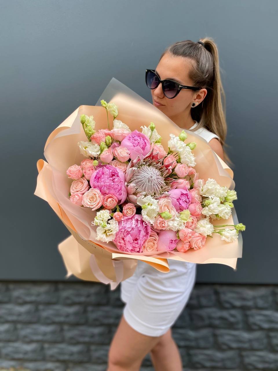 Пышные пионы окружены воздушными эустомами и миниатюрными кустовыми розами, а экзотичная протея добавляет композиции выразительный акцент. Бархатистые лепестки чередуются с полураскрытыми бутонами, создавая объёмную фактуру и глубину букета.