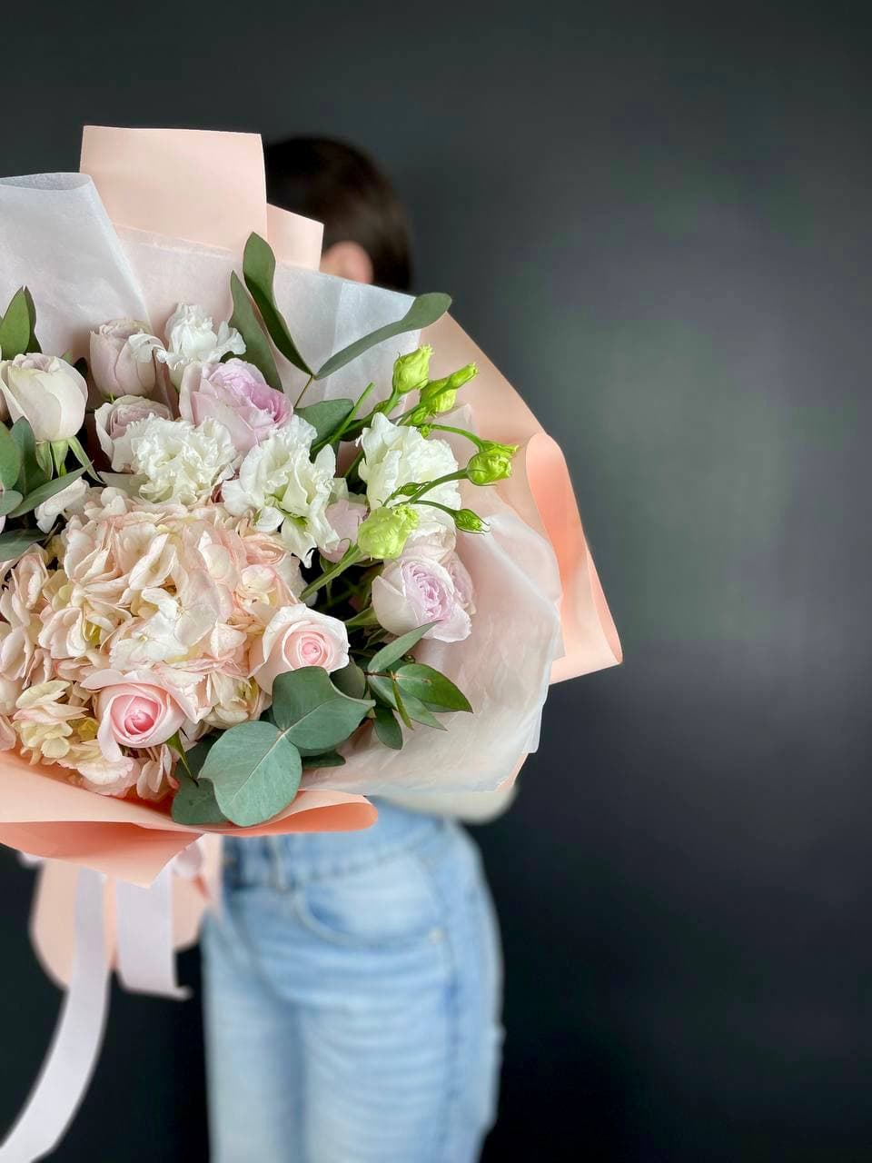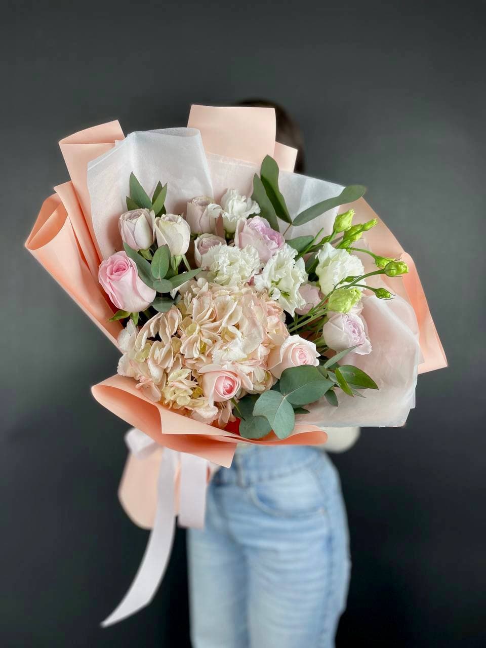 маттиола, диантусы, пионовидные розы Мисти Баблс, эвкалипт, лимониум, эустома лента, упаковка.