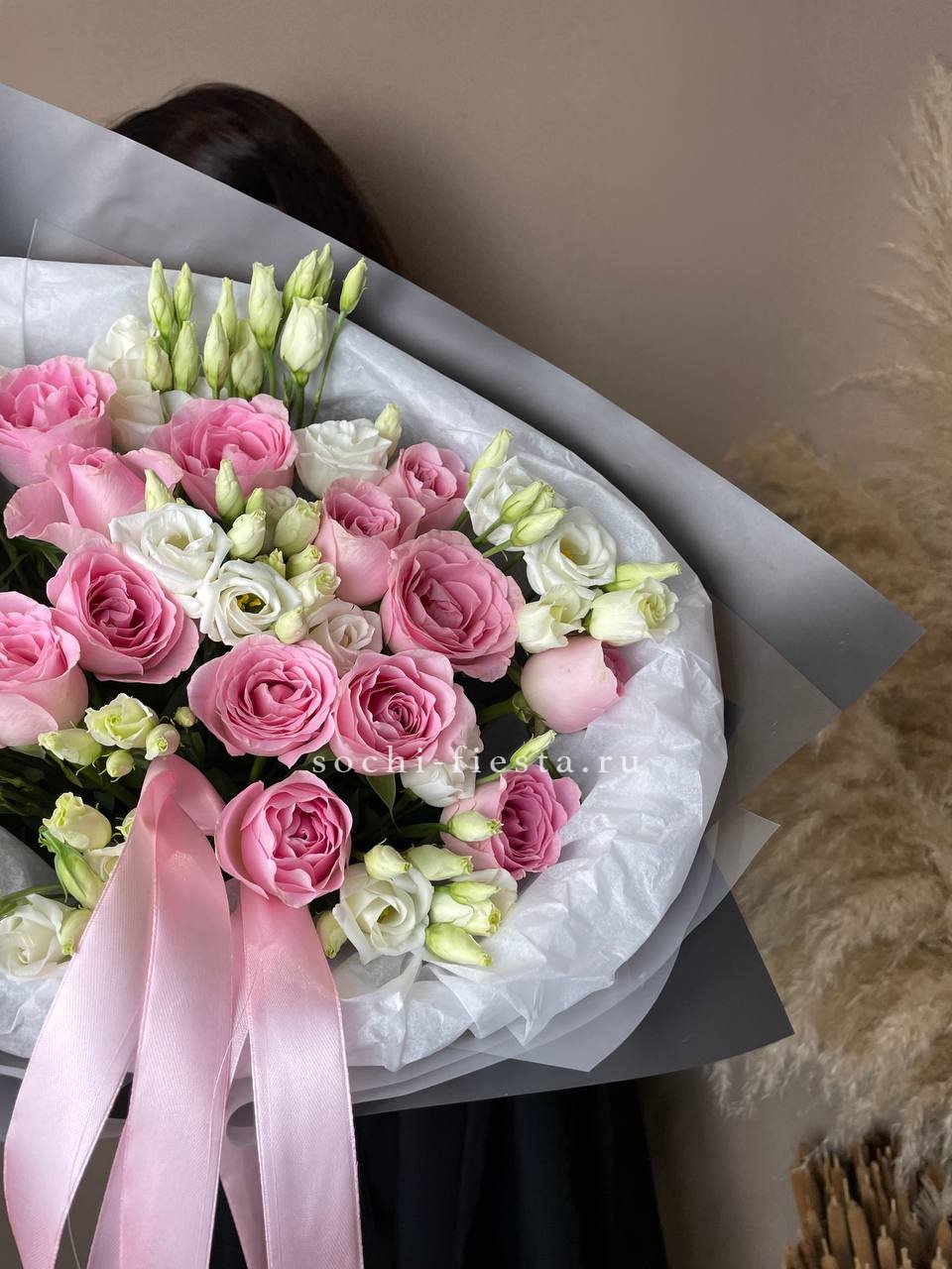 розы одноголовые, кустовые розы, озотамнус, диантусы, эвкалипт, лента, дизайнерская упаковка.