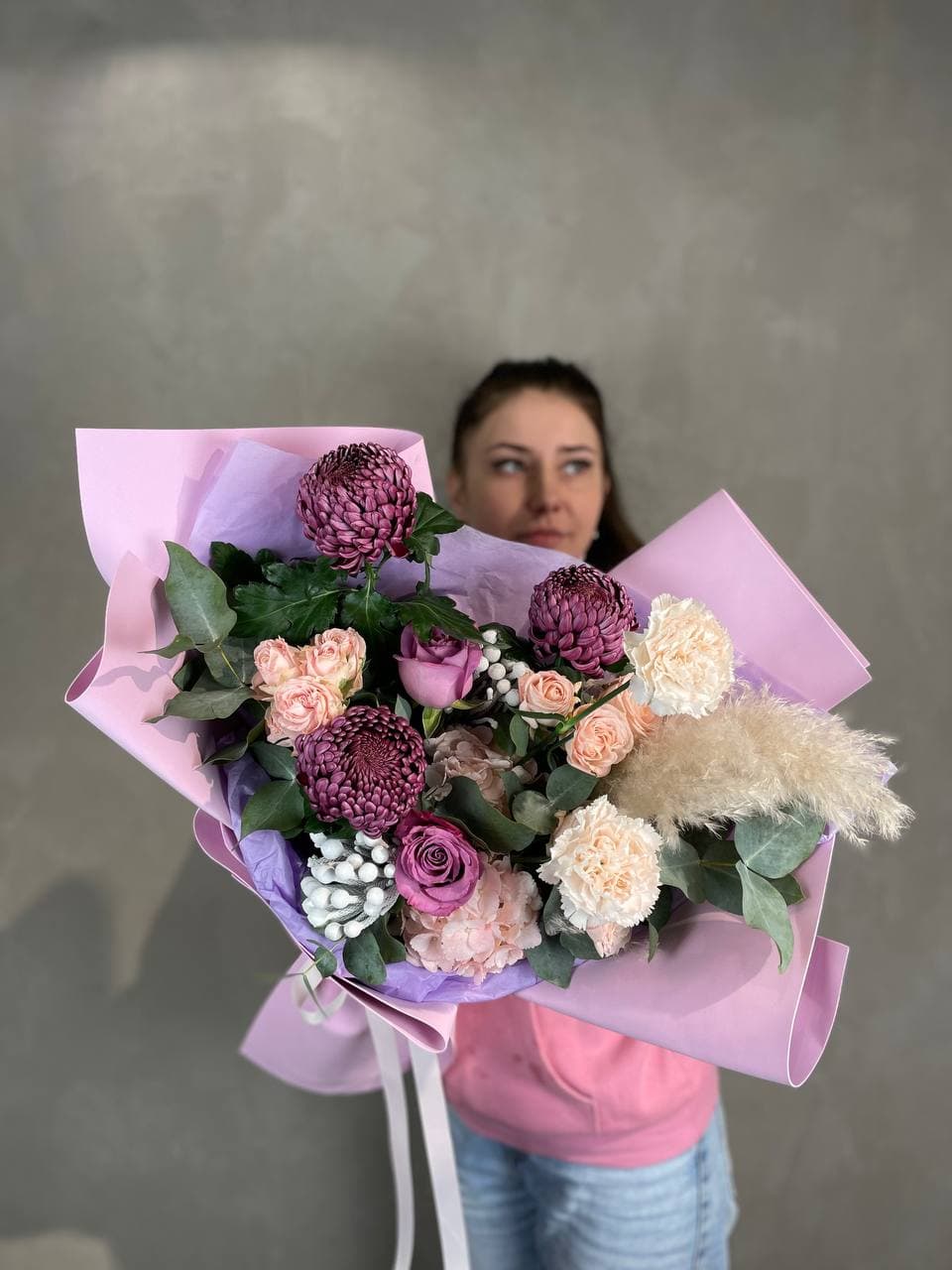 гортензия, бруния, роза, диантусы (или эустома), хризантема, пионовидная кустовая роза, эвкалипт, помпас, дизайнерское оформление.