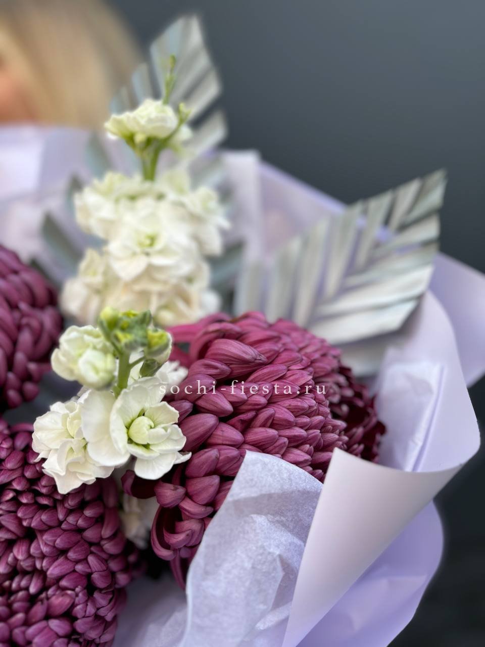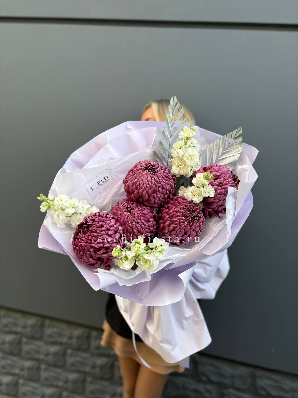 Графичные соцветия бигуди встречаются с воздушной маттиолой в неожиданном дуэте. Листья чики или эвкалипт расставляют акценты и создают глубину между яркими формами.