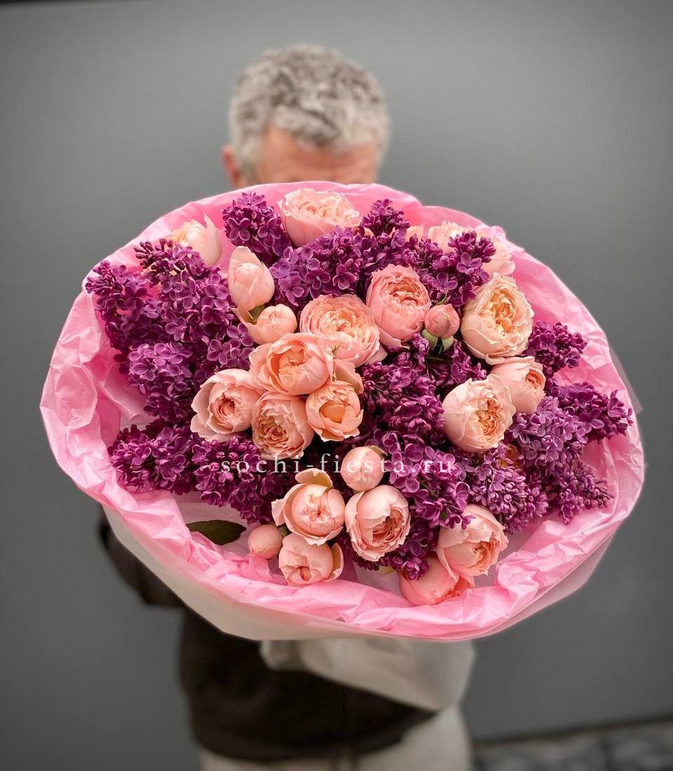 сирень, кустовые пионовидные розы, тишью, пленка, лента.