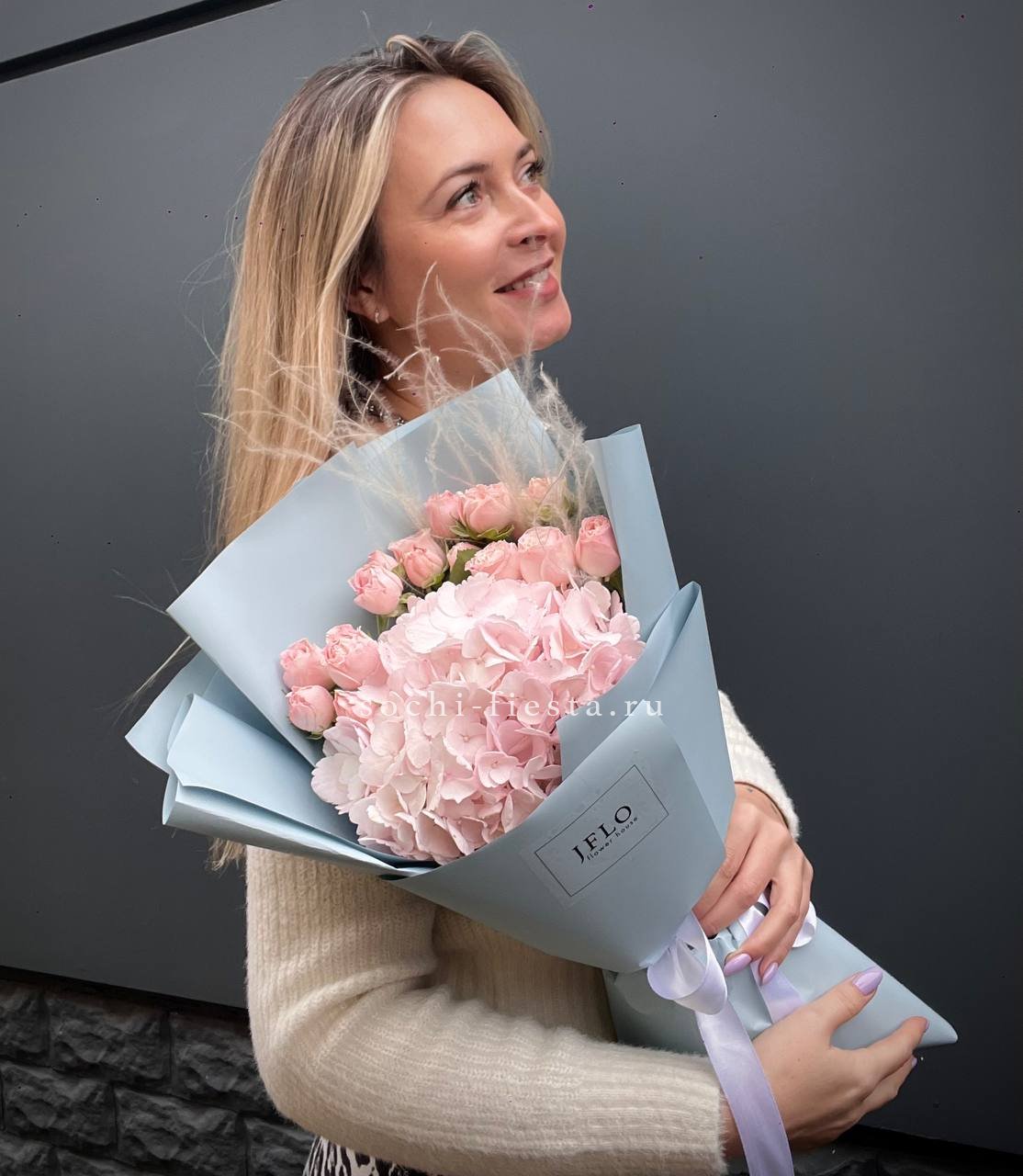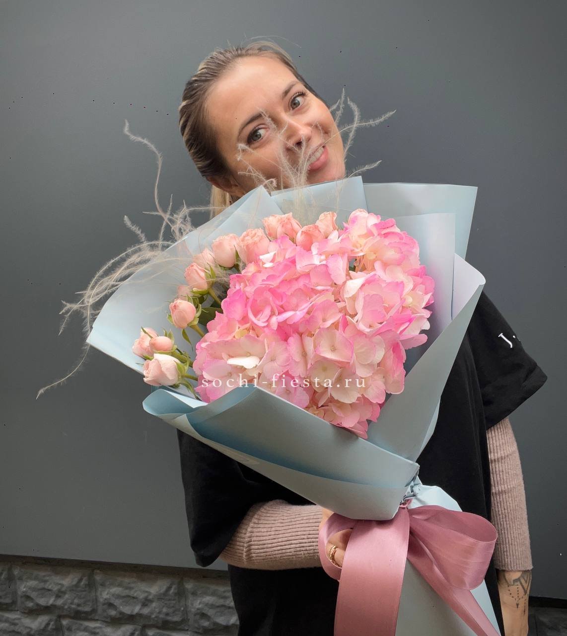 гортензия, пионовидные розы, пампасная трава (стифа), лента, дизайнерская упаковка.